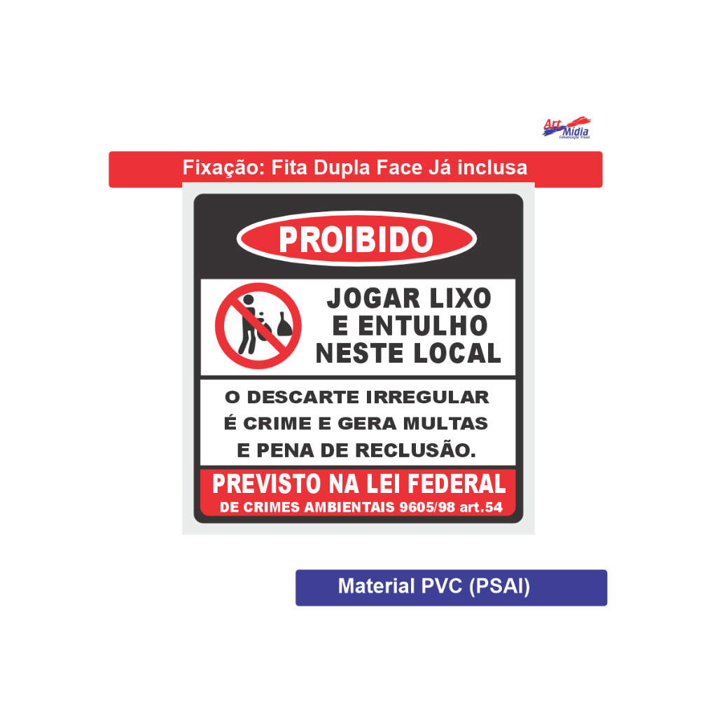 Mantenha sua área limpa e evite descarte irregular com esta placa de sinalização "Proibido Jogar Lixo e Entulho", produzida em material resistente e ideal para ambientes externos. Com design claro e objetivo, a placa inclui menção à Lei Federal e Artigo, reforçando a autoridade da mensagem e aumentando a conscientização e o respeito às regras. 🛠️ Especificações do Produto: Produto: Placa de Sinalização “Proibido Jogar Lixo e Entulho com Lei Federal” Material: PS (Poliestireno) de alta resistência Tamanho: 30x30 cm Espessura: 1,5 mm Acabamento: Impressão de alta definição com excelente visibilidade Indicação de uso: Áreas externas como calçadas, terrenos, muros, entradas de condomínios, obras, etc. Benefícios: ✅ Resistente ao sol e à chuva ✅ Instalação fácil em superfícies lisas ou irregulares ✅ Comunicação clara e profissional ✅ Ajuda na prevenção de infrações ambientais e reforço das normas locais Produto à pronta entrega com envio rápido para todo o Brasil. Compre com segurança! Somos empresa com loja física e mais de 20 anos de experiência no setor de sinalização. 📩 Ficou com dúvidas? Entre em contato pelo chat, nossa equipe está pronta para te atender!