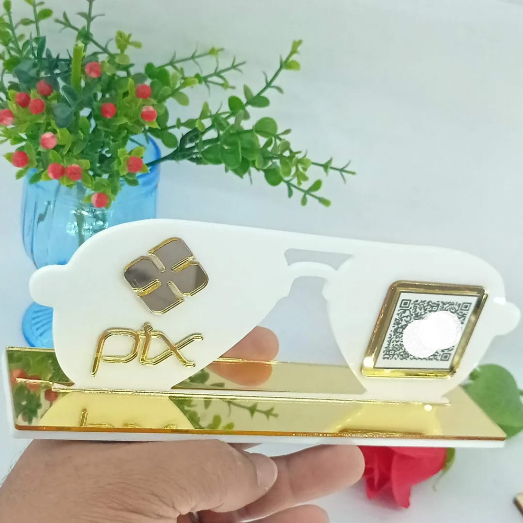 Placa QR code pix para ótica. Medidas: 5x8,5x20 cm Modelo: Cor branco com Gold Cor preto com Gold