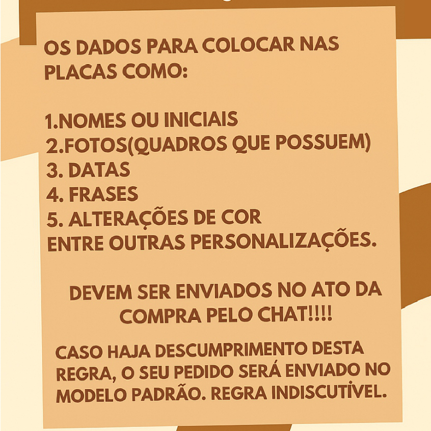 LEO DECORAÇÕES>>>>> ✅Sobre o produto: Trabalhamos com as seguintes medidas... Especificações Técnicas - Medida da Plaquinha: 1PEÇA 90x60/ MEDIDA 1PEÇA 60x40/ MEDIDA 1PEÇA 20x30/ MADIDA 1PEÇA 50x30/ MADIDA ( SELECIONAR A MEDIDA NA VARIAÇÃO) ✔ A instalação é simples, sendo feita por meio de fitas dupla face inclusas na embalagem ✔ Garantimos o produto de qualidade ou poderá pedir o seu dinheiro de volta. ✔ Embalagem feita com liner, plástico bolha e caixa de papelão para que receba seu produto em perfeito estado. ✅Diferencial do nosso produto: ✔ Nossos quadros são impressos em vinil semi brilho de alta qualidade, utilizamos MDF com espessura de 3mm, para que tenha um produto de alta qualidade e resistente. Não precisa de moldura, pois o acabamento das bordas é feito com a própria imagem, para uma visão super realista e com boa profundidade do produto. ✅Conteúdo da Embalagem: ✔ Conteúdo da embalagem 01 quadro ✅Avisos e Cuidados: ✔ Utilize um pano úmido com apenas água para garantir maior durabilidade do produto. ⚠️ Por favor, após a compra deixar os dados a serem colocados no chat ou em observação. Caso o nome não for enviado após a compra, o produto será enviado sem o nome. Agradecemos a compreensão.