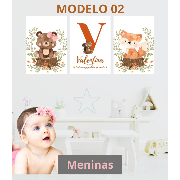 Placa Quadro Decorativo MDF 3 Peças Personalizada Infantil Floresta Animais Bosque Encantado Urso Raposa