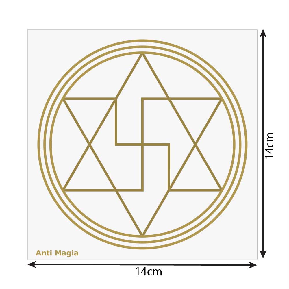 Placa Radiônica Anti Magia Descrição: Este gráfico é um poderoso símbolo de proteção contra quaisquer tipos de energias negativas emanadas, tanto pelo pensamento de pessoas que não querem a sua felicidade, até energias provenientes de magias, rituais ou trabalhos feitos com o intuito de prejudicar. Ele funciona como um escudo para as pessoas que estão expostas aos ataques psíquicos como a inveja, a ganância e a cobiça das outras pessoas sobre o que você conquistou em sua vida. Pode ser utilizado em tratamentos à distância, tanto para você quanto para terceiros, com o uso de pedido e testemunho no centro do gráfico. Quando usada em ambientes, portas de entrada ou pelo lado de fora da construção, esta placa faz a proteção contra pensamentos negativos, transmutando as energias densas e trazendo proteção para quem a usa. Esta placa pode ser usada para pessoas que queiram eliminar vícios, para isso, deve-se colocar o pedido e o testemunho devidamente limpos e potencializados energeticamente no centro do gráfico até que a pessoa esteja em paz e livre do vício. Especificações: Aplicações: Proteção contra pensamentos negativos, ataques psíquicos, magias e outros trabalhos feitos com o intuito de prejudicar. Eliminar vícios como alcoolismo, drogas e outras substâncias que criam dependência. Use seu poder com Responsabilidade! Dados Técnicos: Dimensões: 14,0 x 14,0 (cm).Material: Placa em PS impressa em tinta dourada com liga especial.Duração: Validade permanente enquanto estiver intacto o gráfico e sem manchas na placa.