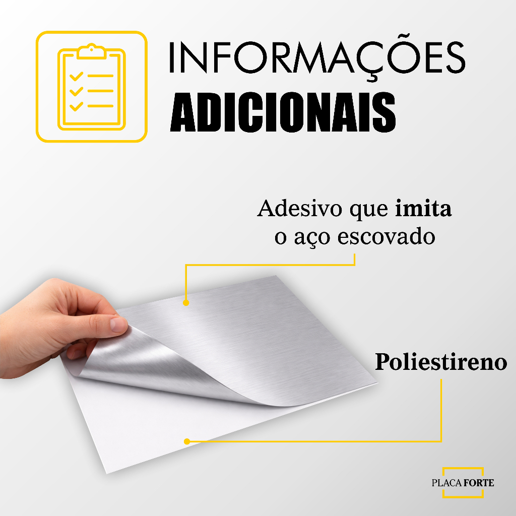 Placa de Sinalização Fraldario Aço Escovado 30x10cm em PS 1mm Atenção - Nossas placas são de adesivo vinil que imita aço escovado impresso em PS (poliestireno 1mm). Procurando uma placa de sinalização elegante e funcional para identificar fraldeiros? Temos a solução ideal! Somos referência no mercado e garantimos a sua satisfação com produtos de alta qualidade. Junte-se a milhares de clientes que confiam em nossos produtos. ESPECIFICAÇÕES Tamanho: 10x30cm (largura x altura) Material: Plástico de Poliestireno (PS 1mm) Conteúdo da embalagem: 1 Placa de Sinalização Fraldaria e 1 conjunto de fita dupla face VHB VANTAGENS Fácil Aplicação: Pode ser fixada em qualquer superfície limpa e lisa Durabilidade: Material resistente que garante longa vida útil Visibilidade: Design claro e impactante para fácil identificação Resistência: Adequado para uso interno e externo, resistente à água e umidade DÚVIDAS FREQUENTES É RESISTENTE? Sim, o PS de 1mm é robusto e durável POSSO PERSONALIZAR A PLACA? Não, este produto já vem pronto e embalado DA PARA COLOCAR EM PORTÃO DE GRADE? Sim, desde que a superfície seja limpa e lisa DA PARA FURAR? Sim, é possível furar para fixação VOCÊS FURAM A PLACA PARA MIM? Não, este produto já está embalado e não é possível personalizar a furação TEM OUTROS TAMANHOS? Sim, entre em contato e nossa equipe fornecerá as opções disponíveis Fabricação Própria, Especializada em Placas.