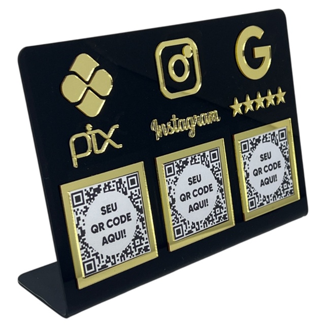 Placa Tripla Pix Instagram Google Display Plaquinha Qr Code Mesa Suporte Caixa Bancada Preto Dourado