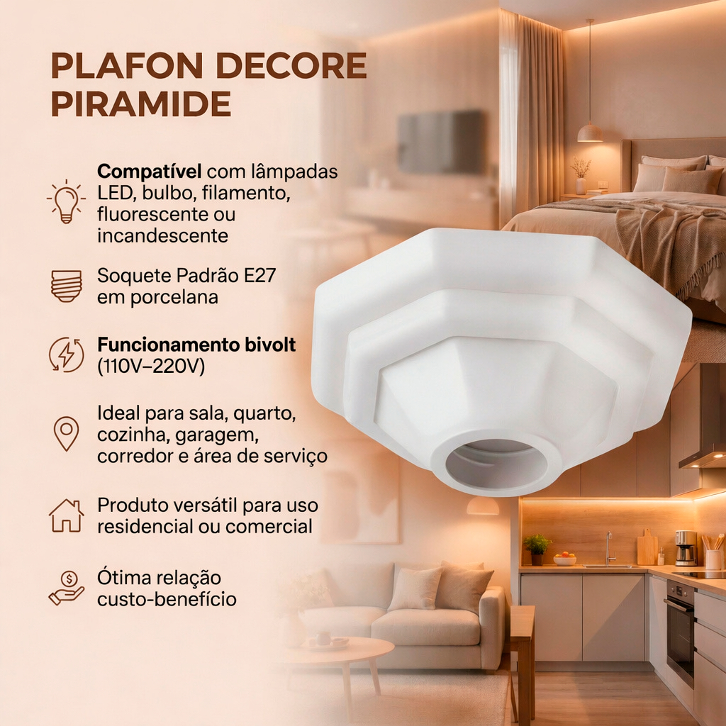 💡 PLAFON PIRÂMIDE DECORE – ILUMINE COM ESTILO E SOFISTICAÇÃO! ✨ Aproveite para adquirir os kits e garantir ainda mais economia no valor unitário de cada plafon! O Plafon Pirâmide Decore transforma seus ambientes com um visual moderno e elegante, oferecendo iluminação eficiente e valorizando qualquer espaço da sua casa ou escritório. ➤ DETALHES DO PRODUTO ✔️ DESIGN ELEGANTE E VERSÁTIL Combina perfeitamente com diversos estilos de decoração, desde os mais tradicionais até os contemporâneos, graças ao seu visual minimalista e moderno. ✔️ ACABAMENTO PREMIUM Fabricado com vidro temperado e base metálica resistente, proporciona segurança, durabilidade e muito bom gosto. ✔️ LUZ SUAVE E BEM DISTRIBUÍDA Perfeito para criar uma iluminação uniforme em salas, quartos, cozinhas, corredores e ambientes corporativos. ✔️ INSTALAÇÃO SIMPLES Acompanha kit de montagem que facilita uma instalação rápida e descomplicada. ✔️ COMPATÍVEL COM DIVERSAS LÂMPADAS Funciona com lâmpadas LED, fluorescentes ou incandescentes, contribuindo para economia de energia. ➤ PRINCIPAIS VANTAGENS ✔️ CONFORTO VISUAL Iluminação agradável e acolhedora para qualquer ambiente. ✔️ USO VERSÁTIL Ideal para diferentes espaços residenciais ou profissionais. ✔️ DESIGN QUE ENCANTA Estilo discreto e sofisticado que agrega valor à decoração do ambiente. ➤ INFORMAÇÕES TÉCNICAS • Material do Soquete: Porcelana (E27) • Cor disponível: Branco/Preto • Medidas: 15,5 cm de diâmetro x 5 cm de altura • Tipo de Lâmpada: LED, fluorescente ou incandescente (não acompanha) • Potência Máxima: 60W • Voltagem: Bivolt (110V–220V)