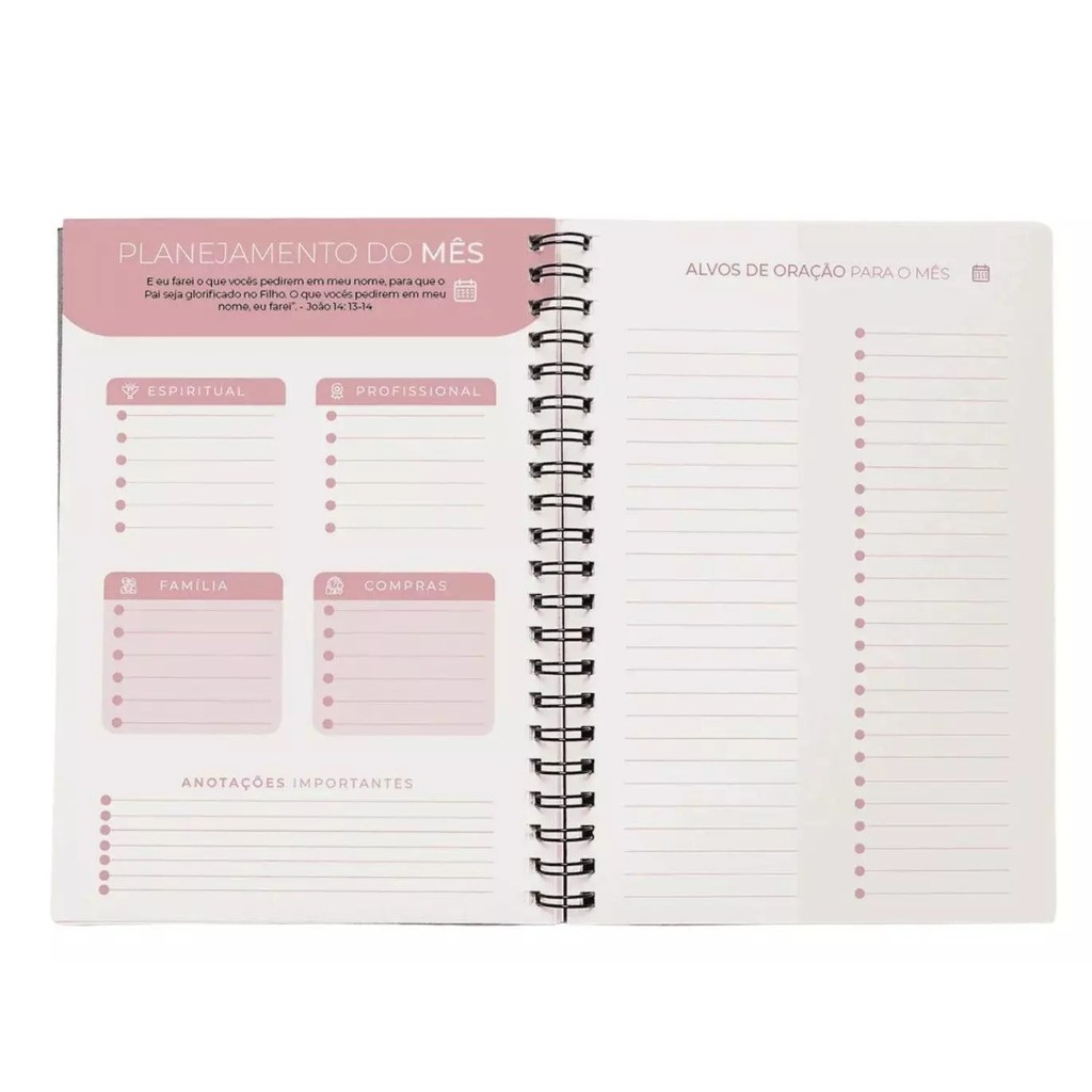 Apresentamos o Planner Meu Propósito, um planner permanente completo, pensado especialmente para mulheres que buscam organização e praticidade sem abrir mão do estilo. Este não é apenas um planner; é um Planner Devocional que, além de ajudar a manter sua vida organizada, apoia seu crescimento espiritual.Com visualizações mensais e semanais, você terá um controle total sobre sua rotina. Confira como o Planner Meu Propósito é estruturado: Organizador Anual: Guia de Leitura da Bíblia Anual Sugestões de Livros Metas para o ano, divididas em Espiritual, Profissional, Família e Compras Alvos de oração para o ano Calendário Menstrual Organizador do Mês: Planejamento mensal dividido em Espiritual, Profissional, Família e Compras Alvos de oração para o mês Espaços para consultas e finanças Anotações de inspirações, anotações gerais e filmes Registro dos aniversários do mês Visualização completa do mês Organizador Semanal: Comece a semana com um devocional inspirador Espaço para anotações diárias Checklist para tarefas recorrentes Além disso, ao final de cada mês, há um espaço livre para usar como preferir. O Planner Meu Propósito é o seu aliado perfeito para se organizar e crescer! 297 Páginas 17x23cm