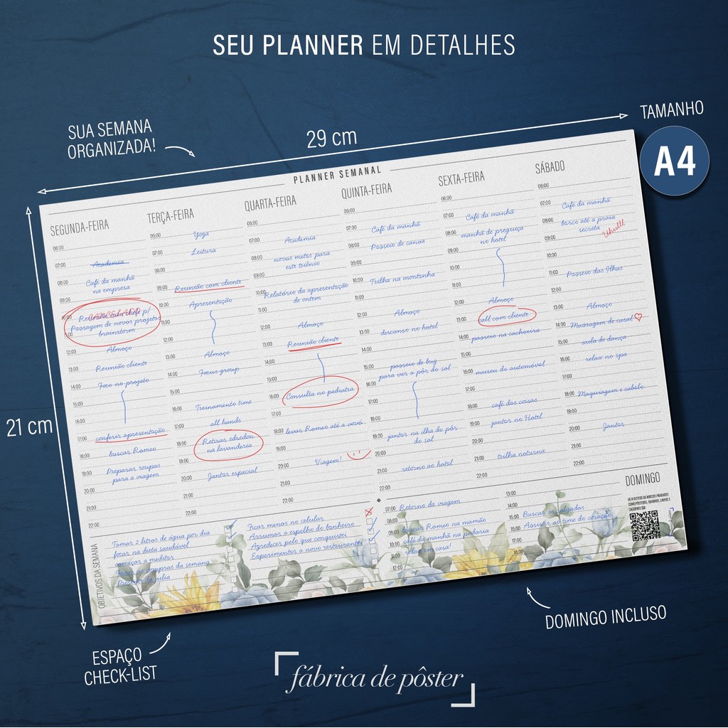 Planner Semanal Floral A4 com 50 folhas destacáveis, planejamento por horário, estampa floral, papel offset 75g e base duplex. ✅ Organização prática da semana inteira ✅ Planejamento por horário – de segunda a domingo ✅ 50 folhas destacáveis – use por quase um ano ✅ Tamanho A4 – espaço ideal para anotações completas ✅ Papel offset branco 75g – resistente e ideal para diversos tipos de caneta ✅ Base em papel duplex branco - proporciona proteção e mais resistência ao bloco ✅ Estampa floral – toque delicado e elegante ✅ Sem datas – flexibilidade total para começar quando quiser Cada folha apresenta uma semana completa com horários, oferecendo uma visão clara para você planejar sua rotina de forma prática e eficiente. O visual com detalhes florais deixa o planejamento mais leve e agradável, ideal para quem gosta de organização com estilo. Use para organizar tarefas, estudos, compromissos, hábitos ou o que for importante na sua rotina. Basta destacar a folha e usar como preferir: na mesa, no mural, no planner, na geladeira ou levar com você. planner semanal floral, bloco semanal A4, planejamento por horário, papel offset 75g, base duplex, organização semanal, agenda semanal destacável, estampa floral, papelaria elegante, planejamento flexível
