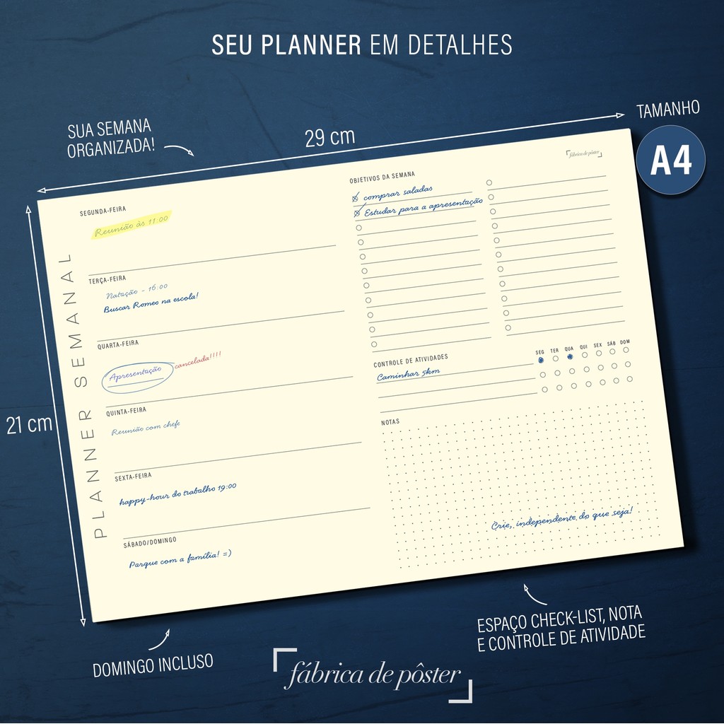 Planner Semanal A4 com 50 folhas, papel avena 80g, base duplex, layout minimalista com checklist e anotações. ✅ 50 folhas tamanho A4, com layout semanal completo ✅ Espaços para planejamento diário de segunda a domingo ✅ Checklist para acompanhar os objetivos da semana ✅ Controle de atividades semanais para aumentar sua produtividade ✅ Área dedicada para anotações extras, ideias e lembretes ✅ Papel amarelado 80g em tom amarelado, com toque suave e ótima legibilidade ✅ Base em papel Duplex branco para maior durabilidade do produto ✅ Enviado com embalagem individual para garantir proteção e qualidade Organize sua rotina com praticidade e estilo usando o Planner Semanal Minimalista. Cada folha é personalizada com um design minimalista, que facilita o planejamento sem poluir visualmente, ideal para quem busca foco e produtividade. Com espaços específicos para o planejamento diário, checklist de objetivos e anotações, você terá tudo o que precisa para planejar suas semanas com eficiência. O papel amarelado 80g, em tom amarelado, oferece conforto visual e excelente qualidade para anotações. Além disso, a base em papel Duplex branco garante proteção do bloco durante o uso. Tudo isso embalado com cuidado para chegar perfeito até você. planner semanal, planner a4, organização semanal, papel amarelado, checklist semanal, produtividade, planejamento semanal, planner minimalista, papelaria criativa, bloco semanal, planner elegante, bloco organizador, planner papel avena, base duplex, papelaria funcional, bloco para escritório