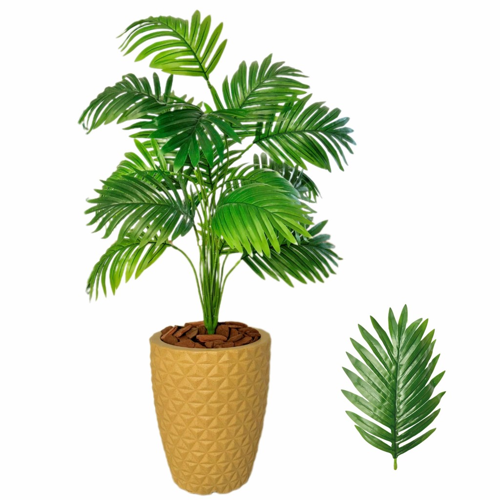 Adicione beleza natural à sua casa sem a preocupação da manutenção com nossa planta artificial. Não precisa regar, podar ou expor ao sol. Feita com materiais de qualidade, é durável e versátil, adequada para uso interno. Uma opção sustentável que contribui para a preservação do meio ambiente. Transforme seu espaço em um oásis verde e convidativo. Adquira nossa planta artificial de qualidade." Caracteristicas da Planta: Origem: Importado Material: Arame e Plástico Medidas: Alt 65cm x Larg 50cm Planta: Palmeira Cor: Verde Folhas: 18 Medidas da Folha: 22cm x 15cm Caracteristicas do Vaso: Material: Polietileno Medidas: Alt. 29cm x Larg. 25cm Origem: Nacional Altura Montado 80cm VOCÊ VAI PRECISAR DE PAPEL OU PAPELÃO PARA PREENCHER O VOLUME DO VASO ITENS INCLUSOS . VASO . PLANTA ARTIFICIAL . ESPONJA FLORAL . CASCA DE PINUS