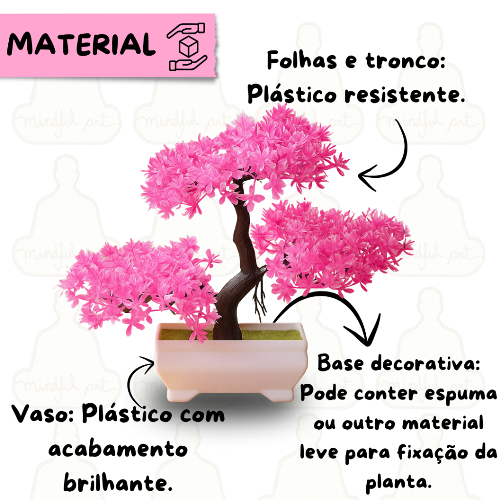 Planta Bonsai Nuvem Artificial – Folhas Rosa Vibrante em Vaso Branco Retangular