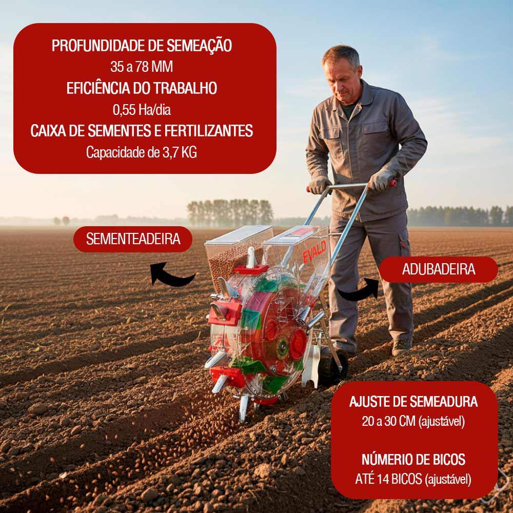 Plantadeira Adubadeira Manual Giratória de Empurrar 14 Bicos Ajustáveis EPAM-14 — EVALD A Plantadeira Adubadeira Manual Giratória de Empurrar EPAM-14 EVALD foi desenvolvida para quem busca eficiência, precisão e praticidade no plantio manual. Ideal para o cultivo de diferentes tipos de sementes, como milho, feijão, amendoim, algodão e girassol, ela oferece desempenho superior em terrenos planos, inclinados e até montanhosos. Fabricada com plástico de engenharia em policarbonato transparente, a EPAM-14 combina resistência e durabilidade com visibilidade total do processo de semeadura. Seu sistema giratório e de empurrar proporciona distribuição uniforme das sementes e adubo, reduzindo o desperdício e otimizando a produtividade por hectare. O design ergonômico e científico garante uma semeadura precisa e ajustável, permitindo controlar a distância entre as sementes (20 a 30 cm) e a profundidade de plantio (35 a 78 cm). Além disso, o equipamento permite o ajuste da quantidade de furos (1 ou 2), adaptando-se às necessidades específicas de cada cultura. Características técnicas Marca: EVALD Modelo: EPAM-14 Tipo: Plantadeira e Adubadeira Manual de Empurrar Material: Policarbonato transparente de alta resistência Funções: Cultivo e fertilização simultânea Sementes compatíveis: Milho, feijão, amendoim, algodão, girassol e similares Profundidade de semeadura: 35 a 78 cm (ajustável) Espaçamento entre sementes: 20 a 30 cm (ajustável) Número de bicos/pregos: 14 (ajustáveis) Taxa de perfuração: 1–2 furos (regulável) Capacidade total das caixas: 3,7 kg Eficiência de trabalho: até 0,55 hectares/dia Benefícios Alta produtividade: cobre até 0,55 hectares por dia, otimizando o tempo de trabalho. Plantio preciso: ajuste da distância e profundidade conforme o tipo de cultura. Resistência superior: construção em policarbonato transparente, durável e leve. Versatilidade: ideal para terrenos planos, colinas ou áreas montanhosas. Eficiência ecológica: reduz o desperdício de sementes e adubo. Fácil operação: sistema de empurrar com rodas, leve e ergonômico. A EPAM-14 EVALD é a escolha perfeita para agricultores e produtores rurais que desejam plantar com eficiência, precisão e economia. Seu sistema giratório e de bicos ajustáveis garante um plantio uniforme, sustentável e de alto rendimento — essencial para quem busca resultados profissionais. *Imagens meramente ilustrativas