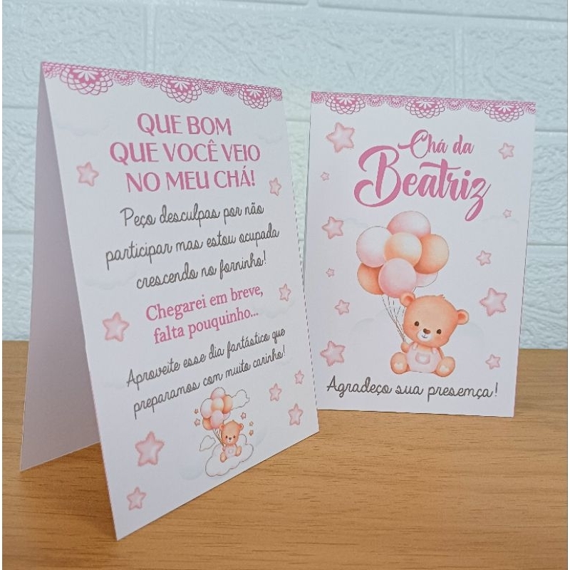 Plaquinhas de Agradecimento para Centro de Mesa - Festa Infantil / Chá Revelação / Chá de Bebê FRENTE E VERSO Tamanho: 10x14cm Impressas em Papel Offset 180g --- OBSERVAÇÃO: -Enviar via chat todos os dados para personalização; *Para aniversário, nome + idade *Para Chá de Bebê, Nome do Bebê. *Para Chá Revelação, Nomes dos Bebês. Caso não recebermos os dados de personalização, o produto será confeccionado somente no tema sem nenhuma escrita. No caso de Chá Revelação será com as escritas "Menino ou Menina" ------- -Impressão em papel OFFSET 180g, com ótima definição e acabamento; -Não fazemos alterações na arte, apenas inserimos os dados informados. --- ATENÇÃO: Não encontrou o tema que precisa? Nos chame no chat que elaboramos a arte para você. . Tire todas as suas dúvidas antes de efetuar a compra. Estamos à disposição no chat!