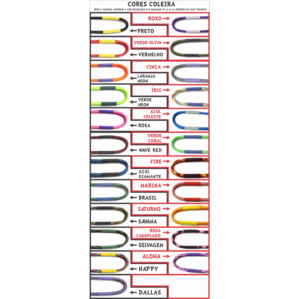 Plaquinhas de identificação EM AÇO INOX CIRÚRGICO (diversos modelos), gravadas a laser (gravação computadorizada com os equipamentos mais modernos encontrados atualmente no mercado mundial), e coleira para uso permanente e ajustável. As coleiras são confeccionadas em Paracord “material incialmente criado para ser utilizado no paraquedismo, alpinismo entre outros seguimentos” totalmente hipoalergênico, extremamente leve, confortável e resistente! Nosso produto é personalizado, elegante e de qualidade incomparável. Sua idealização primária foi feita baseada em um conceito extremamente importante de alerta para qualquer tutor: O SEU PET NÃO MARCA HORA PARA SE PERDER OU FUGIR!! Confira abaixo as especificações e instruções para escolha: ============================================= ESPECIFICAÇÕES / DIFERENCIAIS COMPETITIVOS - PLAQUINHA => AÇO INOXIDÁVEL CIRÚRGICO (NÃO É CROMADO / NÃO É DE ZAMAC / NÃO DESCASCA/ HIPOALERGÊNICO). - ARGOLA QUE ACOMPANHA A PLAQUINHA => AÇO INOXIDÁVEL (NÃO DESCASCA E NÃO CAUSA ALERGIAS DE PELE). - GRAVAÇÃO => LASER, BAIXO RELEVO (DIFERENTE DAS IMPRESSAS, A GRAVAÇÃO É PERMANENTE, NÃO SAI E NÃO DESBOTA). GRAVAÇÃO DO NOME NA FRENTE E ATÉ 2 TELEFONES NO VERSO. INFORMAÇÕES DE COMO ENVIAR OS NOMES LOGO ABAIXO. - COLEIRA => COLEIRA CONFECCIONADA EM CORDAME DE PARAQUEDAS, DIVERSAS CORES E TAMANHOS, DESENVOLVIDA PARA USO CONSTANTE, TRAZENDO CONFORTO E SEGURANÇA PARA SEU PET. HIPOALERGÊNICO E AJUSTÁVEL. MODELO MUITO USADO NA EUROPA ============================================= COMO ESCOLHER OS MODELOS E TAMANHOS? APÓS A REALIZAÇÃO DA COMPRA, IREMOS LHE AUXILIAR NA ESCOLHA DOS MODELOS, ARTES, TAMANHOS E INFORMAÇÕES QUE VOCÊ GOSTARÁ DE COLOCAR EM SEU TAG DE IDENTIFICAÇÃO, ASSIM COMO COM RELAÇÃO ÀS CORES E TAMANHO DA COLEIRA. >>PARA NÃO OCORRER ATRASO, TENTE TEM EM MENTE AS SEGUINTES INFORMAÇÕES PARA NOS PASSAR VIA CHAT (Pós venda): 1) MODELO DA PLAQUINHA COM O NÚMERO CORRESPONDENTE (EXEMPLO: MODELO CASINHA - Nº 4) Você encontrará todos os modelos e referências nas últimas fotos do anúncio. 2) TAMANHO DA PLAQUINHA (EXEMPLO: M) Você encontrará as medidas exatas de cada modelo no final da opção escolhida por você. 3) NOME QUE SERÁ GRAVADO NA FRENTE E OS TELEFONES DE CONTATO DO VERSO, SUGERIMOS ATÉ 2 TELEFONES PARA QUE NÃO FIQUE MUITO EMBOLADO. (EXEMPLO: NOME > TROVÃO / TELEFONES > XX XXXXX-XXXX, YY YYYYY-YYYY ) 4) COR DA COLEIRA (EXEMPLO: CAMUFLADO DESERT) Você encontrará as cores e sua referência em uma das imagens do anúncio 5) TAMANHO DA COLEIRA (EXEMPLO: G) Para definir o tamanho da coleira você pode utilizar nosso guia de raças e/ou utilizar a medida da circunferência do pescoço de seu pet. Como fazer a medida? Utilize um barbante, cadarço ou uma fita para circundar o pescoço de seu pet (não muito apertado), com o auxílio de uma régua, faça a medida da fita para achar a circunferência. Com o resultado obtido faça a correspondência com a tabela a seguir. (Exemplo: Medida circunferência = 23cm => Tamanho P) TABELA MEDIDAS COLEIRA (CIRCUNFERÊNCIA) / GUIA DE RAÇAS P => 20 a 28cm M=> 29 a 42cm G=> 43 a 68cm GUIA DE RAÇAS – COLEIRAS ( UTILIZE APENAS COMO REFERÊNCIA, PARA A ESCOLHA EXATA UTILIZE A FITA MÉTRICA) TAMANHO P – GATOS, POODLE TOY, PINSHER , YORKSHIRE, SPITZ ALEMÃO, CHIUAUA TAMANHO M – POODLE, MALTÊS, PUG, LHASA APSO, BULLDOG TAMANHO G – BULLDOG, GOLDEN, LABRADOR, BOXER, PIT BULL, HUSKY, PASTOR ================================