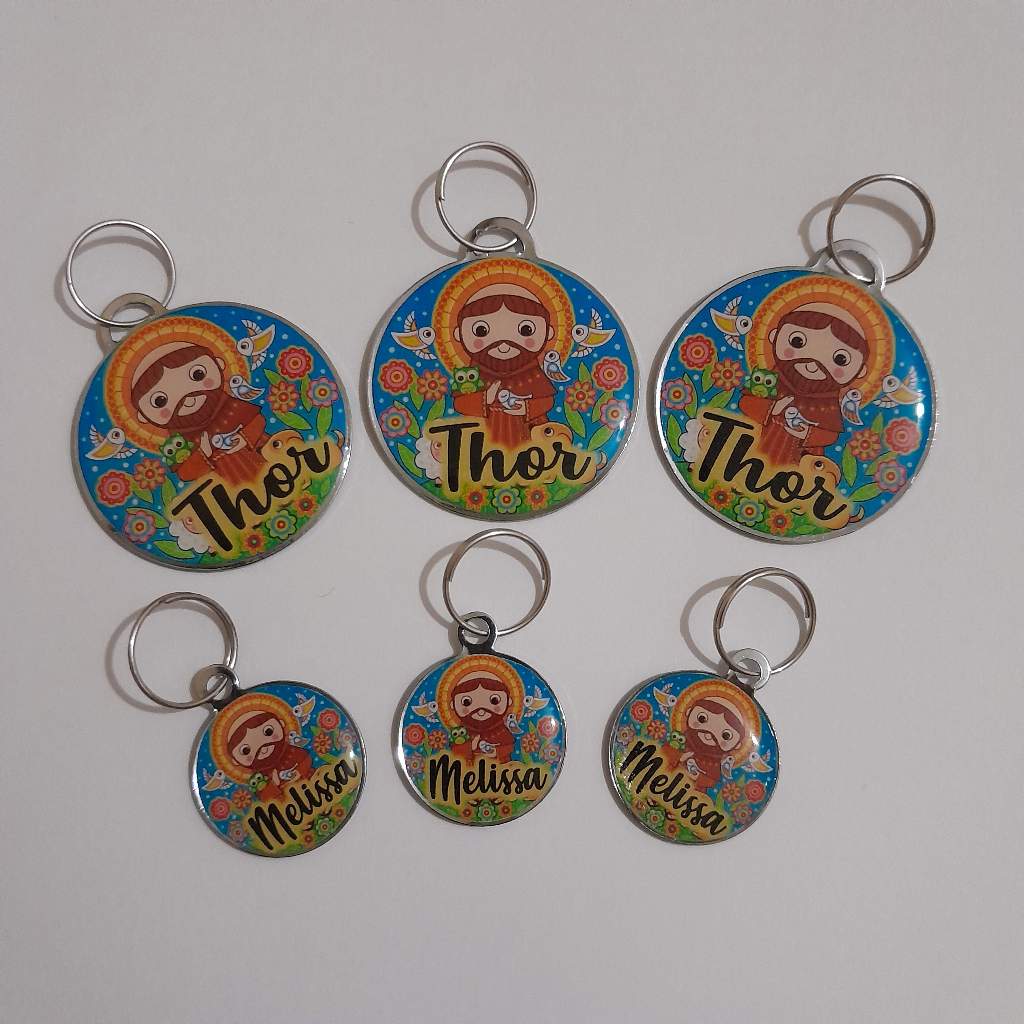 Plaquinha de identificação personalizada para cachorro e gato com tema de São Francisco de Assis, protetor dos animais Na frente vai o nome do pet e no verso vai 01 nome e 01 telefone do tutor(a) ou 02 nomes e até 02 telefones dos tutores Todas as plaquinhas acompanham a argolinha BRINDE: 01 (uma) argolinha extra tamanho G Obs.: sempre verifique o estado de conservação das plaquinhas dos seus pets e os dados contidos nelas Medidas das plaquinhas: Redonda grande: 3,4 cm x 3,4 cm Redonda pequena: 2 cm x 2 cm Após a compra, por gentileza, nos informar no campo de observação de mensagem ou via chat as seguintes informações: - Nome do pet - Nome e telefone do tutor(a) com DDD (até 02 nomes e 02 telefones)