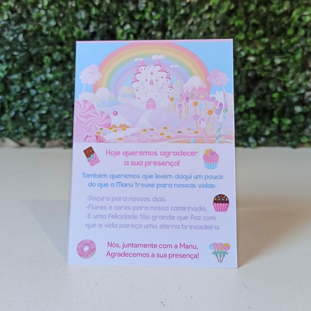 Plaquinha de Mesa Personalizada | Tema Mundo Doce Confeitaria Candy Color 🖼 Arte: Igual às fotos, personalizamos apenas nome e idade. 📄 Material: Papel Fotográfico 180g de alta qualidade, impressão com cores vivas. 📏 Tamanho: 10 x 14 cm (fechada). 🔄 Impressão: Frente e verso. ⏳ Prazo de Produção: 3 dias úteis (produto personalizado sob encomenda, sem pronta entrega). ✨ Como funciona a personalização: Após a compra, envie o nome e idade do aniversariante pelo chat ou no campo "mensagem ao vendedor". ⚠️ Atenção: Se as informações não forem enviadas IMEDIATAMENTE após a compra, o produto será enviado sem personalização. 🚚 Importante: Antes de finalizar sua compra, confira se o prazo estimado de entrega da Shopee atende à data do seu evento. Não nos responsabilizamos caso o prazo de entrega ultrapasse o dia da festa. 💬 Qualquer dúvida, fale conosco no chat. Estamos à disposição! 😉