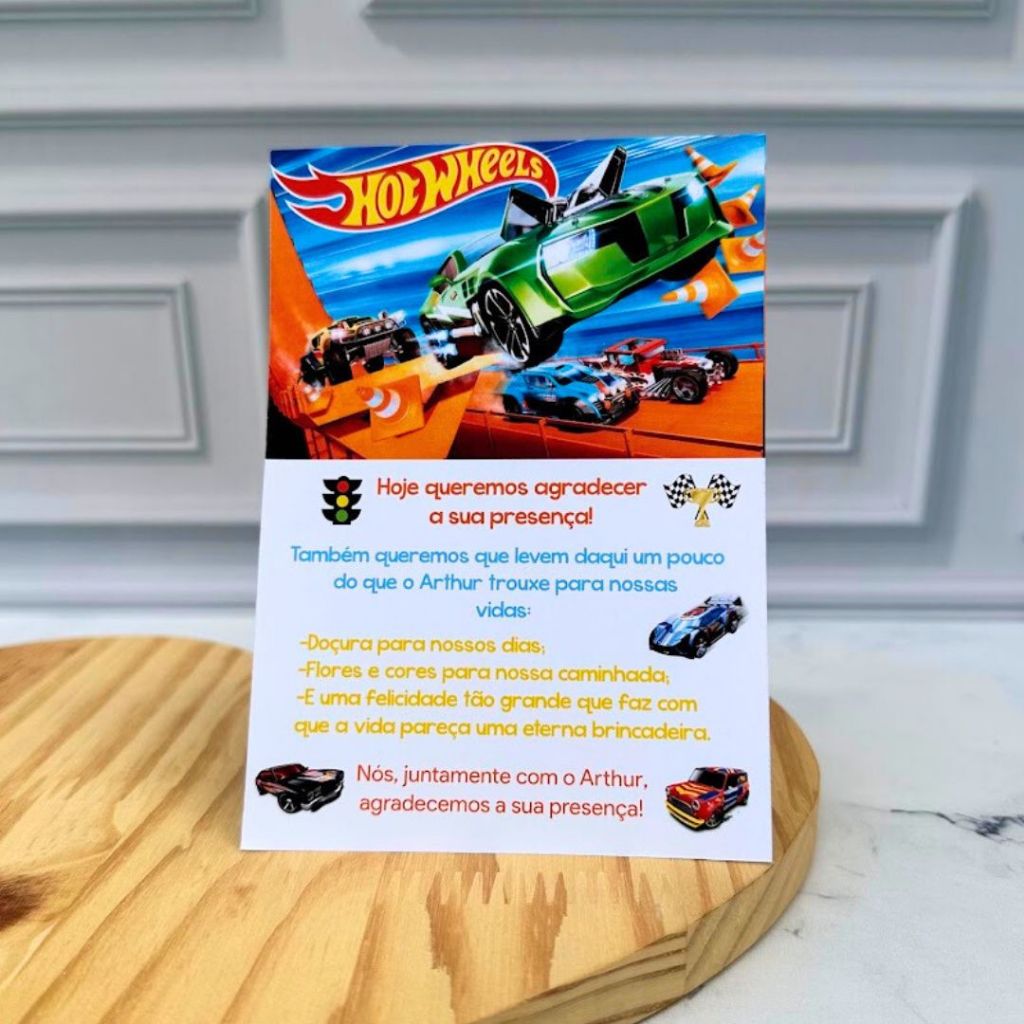 Plaquinha de Mesa Personalizada Tema Hot Wheels 🖼 Arte: Igual às fotos, personalizamos apenas nome e idade. 📄 Material: Papel Fotográfico 180g de alta qualidade, impressão com cores vivas. 📏 Tamanho: 10 x 14 cm (fechada). 🔄 Impressão: Frente e verso. ⏳ Prazo de Produção: 3 dias úteis (produto personalizado sob encomenda, sem pronta entrega). ✨ Como funciona a personalização: Após a compra, envie o nome e idade do aniversariante pelo chat ou no campo "mensagem ao vendedor". ⚠️ Atenção: Se as informações não forem enviadas IMEDIATAMENTE após a compra, o produto será enviado sem personalização. 🚚 Importante: Antes de finalizar sua compra, confira se o prazo estimado de entrega da Shopee atende à data do seu evento. Não nos responsabilizamos caso o prazo de entrega ultrapasse o dia da festa. 💬 Qualquer dúvida, fale conosco no chat. Estamos à disposição! 😉