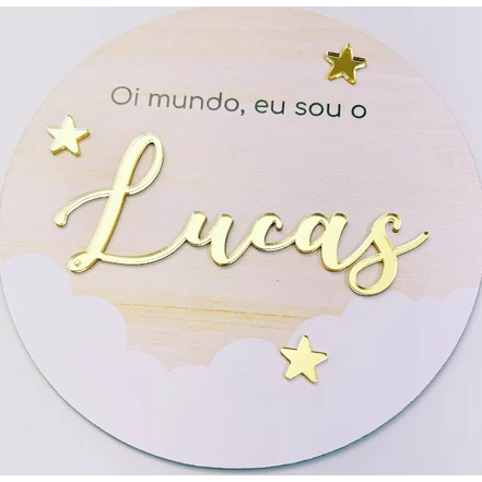 Plaquinha Nascimento "Oi Mundo" - com nome em acrílico