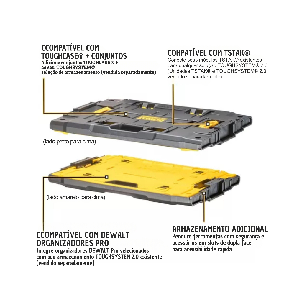Seja bem-vindo a Inter Level Brasil. A Loja de ferramentas e acessórios mais completa do mercado. ***Plataforma Adaptadora Para Toughsystem Para TSTAK DWST08017*** Expanda seus recursos de armazenamento com o adaptador TOUGHSYSTEM® 2.0. Esse adaptador para vários sistemas permite a compatibilidade entre plataformas com os produtos DEWALT® TSTAK™, ToughCase, TOUGHSYSTEM® e Pro Organizer. Conecte módulos novos e existentes para obter uma solução personalizada e durável, versátil o suficiente para seus locais de trabalho mais difíceis. CONECTE TSTAK EM TOUGHSYSTEM: Criando o melhor ecossistema de armazenamento para os usuários finais. CONECTE AS CAIXAS TOUGHCASE PTA E OS ORGANIZADORES TSTAK para TOUGHSYSTEM: permitindo a integração dos Toughcases PTA na plataforma TOUGHSYSTEM SUPORTE INTEGRADO PARA FERRAMENTAS DE ELÉTRICAS: para pendurar furadeiras por meio do gancho de cinto
