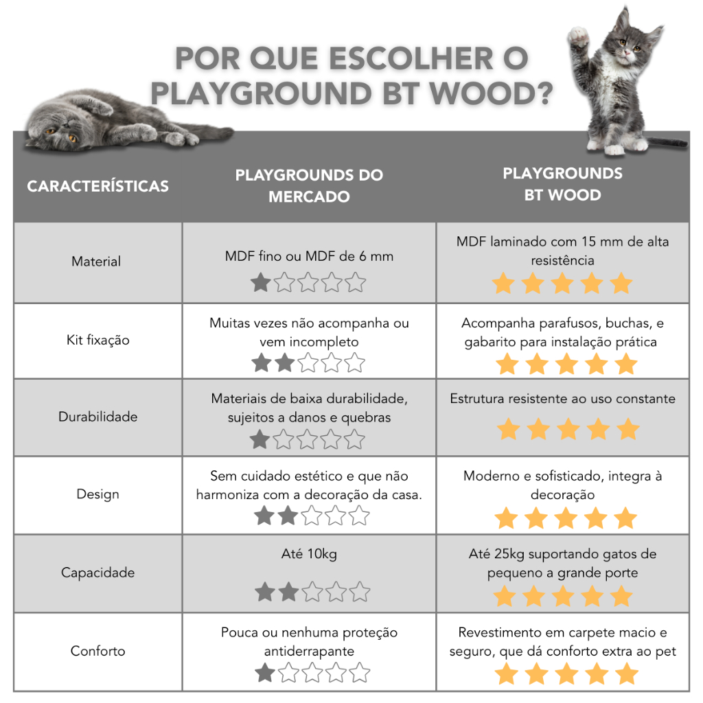 Um Parque Para Gatos Completo Muitos gatinhos vivem dentro de casa sem estímulos suficientes, o que pode causar tédio, estresse e comportamentos destrutivos, como arranhar móveis e subir em locais inadequados. Além disso, muitos playgrounds disponíveis no mercado pecam no design ou na resistência, não combinam com a decoração e não suportam o uso diário dos gatos. Pensando no bem-estar felino e na estética do lar, desenvolvemos o Kit Playground BTWOOD: um verdadeiro parque para gatos que une diversão, segurança, durabilidade e acabamento premium, transformando paredes em áreas de aventura e descanso dentro de casa. Com um design inteligente e modular, o kit cria um parque para gatos completo, aproveitando o espaço vertical de forma funcional e segura. Cada módulo foi cuidadosamente pensado para estimular o comportamento natural do gato, oferecendo desafios, pontos de observação e locais de descanso, ajudando a reduzir o estresse, combater o tédio e canalizar a energia de forma positiva. Além disso, este modelo conta com acabamento laminado premium, que garante resistência superior ao uso contínuo e um visual elegante que se integra facilmente à decoração da casa. O resultado é um playground que não precisa ser escondido: ele faz parte do ambiente e valoriza o espaço. Mais do que um simples arranhador ou acessório, o Kit Playground BTWOOD é um parque para gatos completo, que une estrutura robusta, acabamento premium e design exclusivo, tornando-se um elemento decorativo do lar e um presente especial para os bichanos. Benefícios Diversão garantida: um verdadeiro parque para gatos com tocas, prateleiras, ponte, rede e arranhador. Menos tédio e estresse: mantém o gato ativo, estimulado e emocionalmente equilibrado. Redução de comportamentos destrutivos: ajuda a proteger móveis, cortinas e objetos da casa. Design que encanta: visual moderno e sofisticado, pensado para harmonizar com a decoração. Estrutura robusta e acabamento premium: suporta gatos de pequeno, médio e grande porte. Especificações Técnicas Material: MDF 15mm laminado premium (linha premium, mais resistente). Acabamento: laminado premium + carpete antiderrapante. Sisal: 8mm de alta resistência. Capacidade de carga: até 25kg por módulo. Instalação: kit completo incluso (buchas, parafusos e gabarito). Detalhe exclusivo: frente com recorte em formato de carinha de gato. Estética: acabamento superior, pensado para integrar à decoração da sua casa. Composição do Kit 2 Degraus P: 11 cm (A) × 14 cm (L) × 26 cm (C) 1 Degrau M: 11 cm (A) × 20 cm (L) × 26 cm (C) 2 Degraus G: 11 cm (A) × 35 cm (L) × 26 cm (C) 1 Ponte Suspensa: 28 cm (L) × 50 cm (C) 1 Rede Suspensa: 15 cm (A) × 40 cm (L) × 30 cm (C) 1 Arranhador: Kit de fixação: Parafusos 6×60 mm + Buchas 8 mm Cuidados Instalar em superfície firme e nivelada. Usar apenas em áreas internas e secas. Evitar exposição à umidade, chuva ou sol direto. Limpar com pano seco ou levemente umedecido. Não utilizar produtos abrasivos ou químicos. Com o Kit Playground BT WOOD, seu gato gasta energia, reduz o estresse e vive mais feliz, enquanto sua casa continua linda, organizada e sem arranhões indesejados.