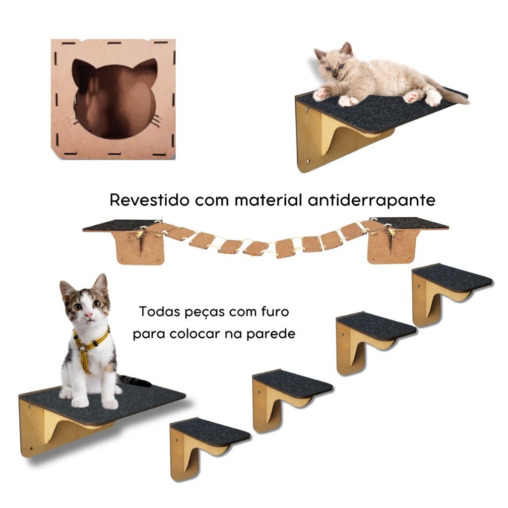 Feito em mdf de 4mm 1 Nicho 4 degraus 1 Ponte suspensa 2 prateleira ___ Ofereça ao seu gato um playground completo e cheio de diversão com este kit composto por 8 peças! Feito em MDF de 4mm, ele é resistente e ideal para criar um ambiente estimulante para o seu felino. O kit inclui 1 nicho para descanso, 4 degraus para facilitar a movimentação, 1 ponte suspensa para momentos de aventura, e 2 prateleiras para exploração e descanso. Com um design inteligente, esse playground proporciona conforto, segurança e muito espaço para o seu gato brincar, descansar e se exercitar. Transforme o espaço do seu pet em um verdadeiro paraíso e garanta sua diversão e bem-estar!