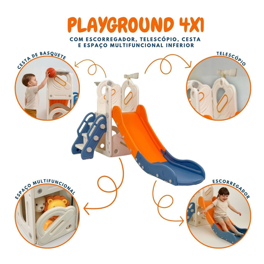 Playground Infantil 4x1 Escorregador Cesta Telescópio Laranja Espaço Multifuncional Importway