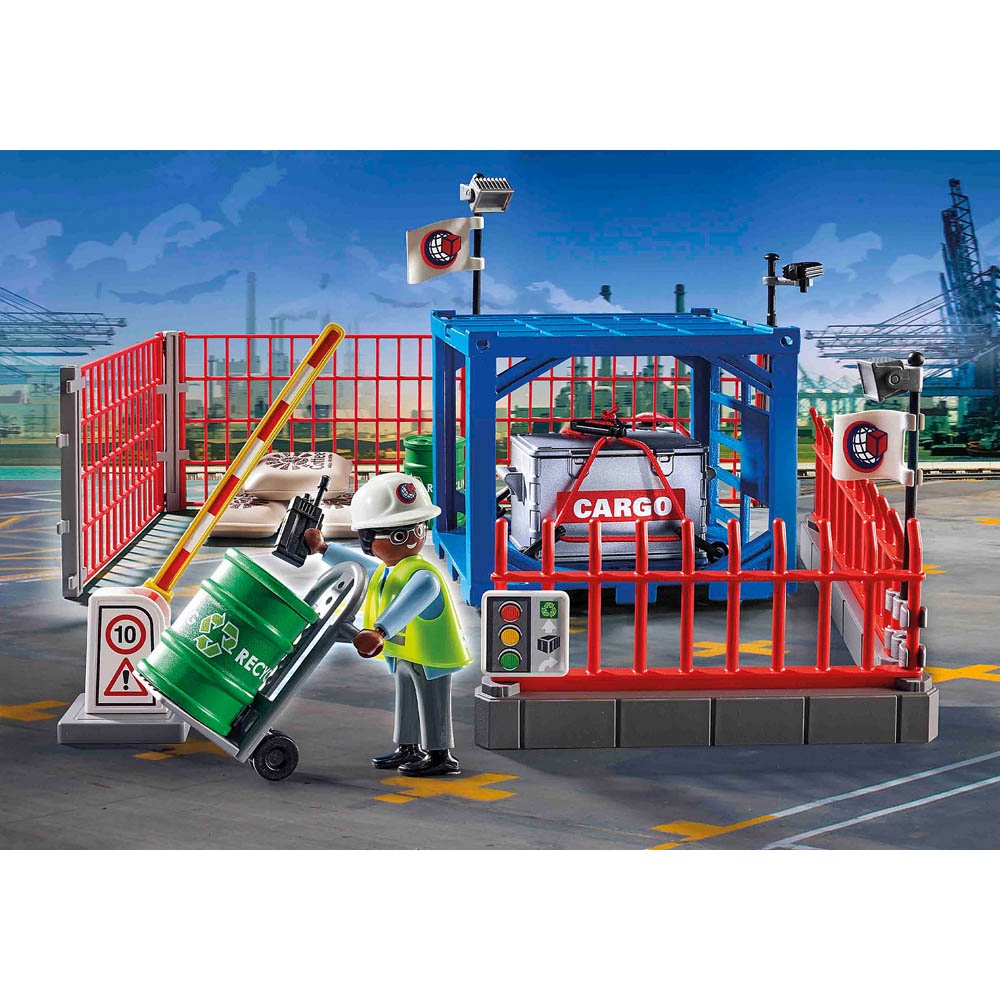 Se o transporte da carga não puder continuar imediatamente, a mercadoria fica temporariamente no depósito de carga. Sejam contêineres, toneladas ou sacos - tudo é armazenado com segurança aqui. Um novo contêiner acaba de chegar. Ele deve ser armazenado temporariamente por alguns dias. Por razões de segurança, o estivador também prende o contêiner à placa de base com uma corda. Agora nada pode escorregar. O playset inclui uma figura PLAYMOBIL, elementos de cerca, uma barreira, um módulo de contêiner e muitos outros extras.