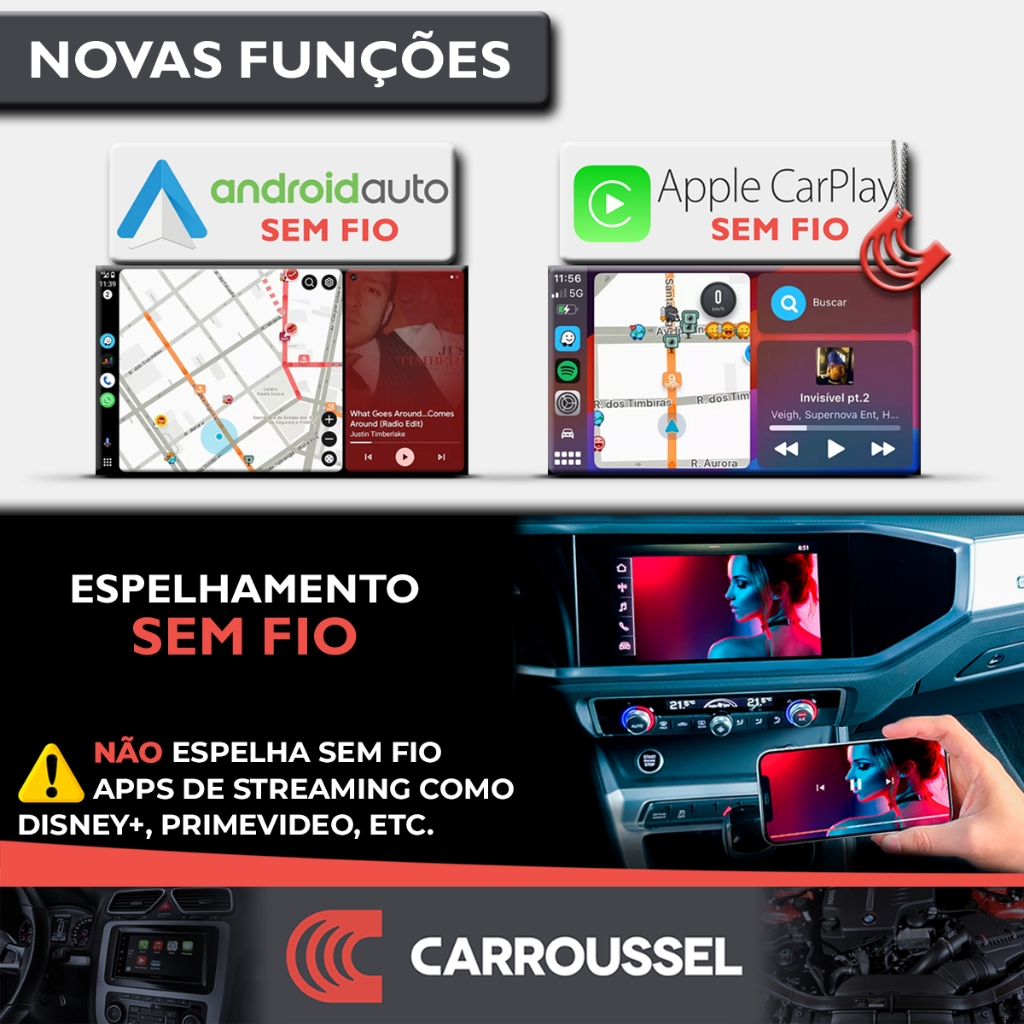 Carroussel Auto apresenta: O módulo perfeito para incluir NOVAS FUNÇÕES em vários carros que já têm multimídia ORIGINAL de fábrica com AndroidAuto VIA CABO e/ou AppleCarPlay VIA CABO ______ #NOVAS FUNÇÕES# - YOUTUBE + NETFLIX já instalados. Funcionando com o roteamento da internet do celular - ANDROID AUTO SEM FIO: controle pela multimídia + funciona com o celular bloqueado - APPLE CAR PLAY SEM FIO: controle pela multimídia + funciona com o celular bloqueado - ESPELHAMENTO SEM FIO: precisa da tela do celular ligada/desbloqueada - MAIS 1 entrada USB para: carregar o celular OU para pendrive com vídeos e músicas - TUDO com o carro em MOVIMENTO, mesmo que o carro tenha algum bloqueio!! ______ #CARROS COMPATÍVEIS# Audi **Compatível Somente em Veículos Com CarPlay e/ou AndroidAuto via cabo USB A3 2018 até 2024** A4 2019 até 2024** A5 2018 até 2024** A6 2020 até 2022** A7 2020 até 2021** E-tron 2020 até 2024** Q3 2020 até 2024** Q5 2020 até 2024** Q7 2021 até 2023** Q8 2019 até 2022** RS 4 2019 até 2021** RS 5 2019 até 2021** RS 6 2021 até 2022** RS 7 2021** RS E-tron 2021 até 2022** RS Q3 2021 até 2022** RS Q8 2020 até 2023** __________ Chery **Compatível Somente em Veículos Com CarPlay e/ou AndroidAuto via cabo USB Tiggo 2 2021 até 2022** Tiggo 3x 2021 até 2023** Tiggo 5x 2019 até 2025** Tiggo 5X Pro 2022 até 2025** Tiggo 7 2019 até 2025** Tiggo 7 Pro 2022 até 2025** Tiggo 8 2021 até 2025** ___________ Chevrolet **Compatível Somente em Veículos Com CarPlay e/ou AndroidAuto via cabo USB Cobalt 2016 até 2020** Equinox 2018 até 2024** Montana 2023 até 2025** Onix 2017 até 2025** Onix Plus 2020 até 2025** Prisma 2017 até 2019** Spin 2018 até 2025** Tracker 2017 até 2025** __________ Fiat **Compatível Somente em Veículos Com CarPlay e/ou AndroidAuto via cabo USB Fastback 2023 até 2025** Mobi 2021 até 2025** Pulse 2022 até 2025** Strada 2021 até 2025** Toro 2020 até 2025 Com CarPlay e tela de 7"** Toro 2020 até 2025 Tela de 8" com CarPlay** __________ Ford **Compatível Somente em Veículos Com CarPlay e/ou AndroidAuto via cabo USB Bronco 2021 até 2024** Ecosport 2018 até 2021** Edge 2018 até 2020** Fiesta 2019 até 2020** Focus 2018 até 2019** Ka 2019 até 2021** Maverick 2022 até 2024** Ranger 2018 até 2025** Territory 2021 até 2025** __________ Honda **Compatível Somente em Veículos Com CarPlay e/ou AndroidAuto via cabo USB City 2022** HR-V 2022** __________ Hyundai **Compatível Somente em Veículos Com CarPlay e/ou AndroidAuto via cabo USB Creta 2017 até 2025** HB20 2018 até 2022 CarPlay via Cabo** IX35 2018 até 2022** Tucson 2018 até 2025** __________ Jeep **Compatível Somente em Veículos Com CarPlay e/ou AndroidAuto via cabo USB Commander 2022 até 2025** Compass 2018 até 2025** Gladiator 2022 até 2023** Renegade 2018 até 2025** ___________ Land Rover **Compatível Somente em Veículos Com CarPlay e/ou AndroidAuto via cabo USB Defender 2020 até 2024** Discovery 2018 até 2024** Discovery Sport 2020 até 2024** Range Rover Evoque 2020 até 2024** Range Rover Sport 2018 até 2024** Range Rover Velar 2018 até 2024** Range Rover Vogue 2018 até 2021** ___________ Mercedes **Compatível Somente em Veículos Com CarPlay e/ou AndroidAuto via cabo USB Classe A 2019 até 2024** Classe C 2019 até 2024** Classe CLA 2020 até 2024** Classe CLS 2019 até 2021** Classe E 2017 até 2023** Classe G 2021 até 2024** Classe GLA 2021 até 2024** Classe GLB 2020 até 2024** Classe GLC 2018 até 2024** Classe GLE 2016 até 2024** Classe GLS 2017 até 2024** Classe S 2018 até 2024** Sprinter 2022 até 2024** ____________ Peugeot **Compatível Somente em Veículos Com CarPlay e/ou AndroidAuto via cabo USB 2008 2018 até 2025** 208 2017 até 2025** 3008 2018 até 2023** __________ Renault **Compatível Somente em Veículos Com CarPlay e/ou AndroidAuto via cabo USB Captur 2018 até 2024** Duster 2018 até 2025** Duster Oroch 2018 até 2025** Kangoo 2025** Kardian 2025** Kwid 2018 até 2025** Logan 2018 até 2025** Oroch 2023 até 2025** Sandero 2018 até 2025** Stepway 2020 até 2025 ** __________ Toyota **Compatível Somente em Veículos Com CarPlay e/ou AndroidAuto via cabo USB Corolla 2020 até 2024** Corolla 2022 até 2023 Tela de 8" com CarPlay e 2 botões giratórios** Corolla Cross 2022 até 2023 Tela de 8" com CarPlay e 2 botões giratórios** Corolla Cross 2024 até 2025** Hilux 2020 até 2025** Hilux SW4 2020 até 2025** Yaris 2020 até 2025** __________ Volkswagen **Compatível Somente em Veículos Com CarPlay e/ou AndroidAuto via cabo USB Amarok 2018 até 2025** Jetta 2018 até 2024** Nivus 2021 até 2024** Polo 2018 até 2025 Tela de 8" com CarPlay** Polo 2021 até 2025 Tela de 10"com CarPlay** T-Cross 2019 até 2025 Tela de 8" com CarPlay** T-Cross 2021 até 2025 Tela de 10"com CarPlay** Taos 2022 até 2024** Tiguan 2018 até 2024** Virtus 2018 até 2025 Tela de 8" com CarPlay** Virtus 2021 até 2025 Tela de 10"com CarPlay**