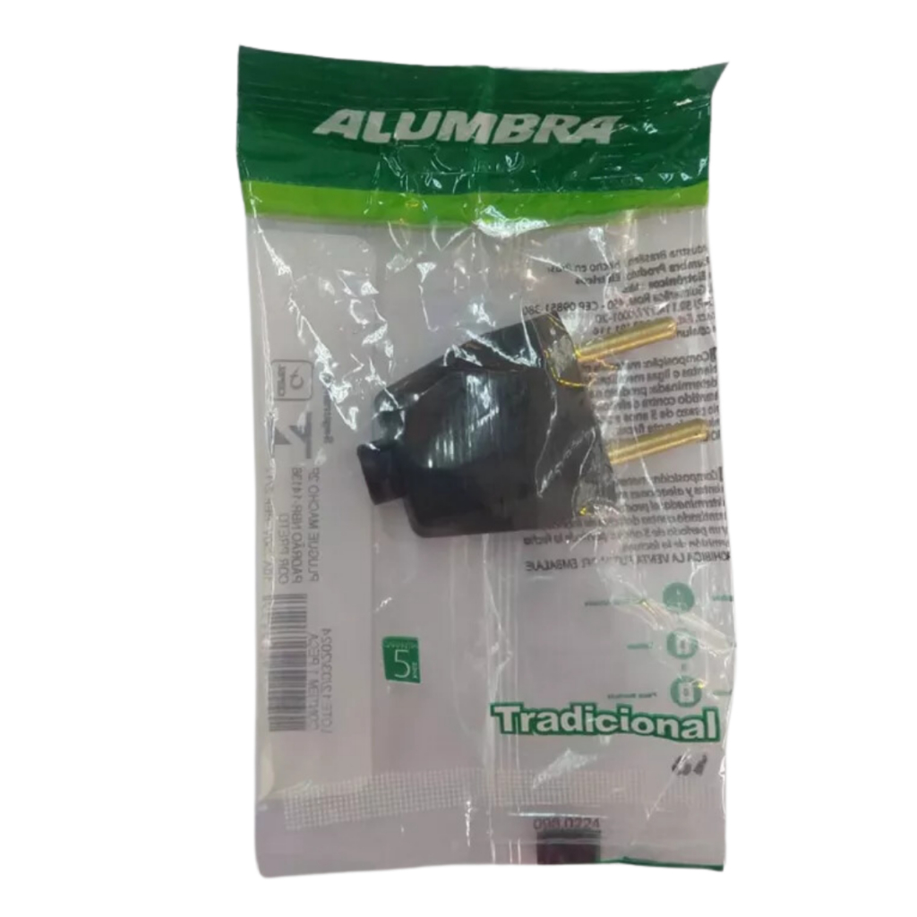 Plugue Macho 2P 10A Alumbra Preto (Modelo 2712) A solução ideal que oferece **segurança e eficiência** em suas conexões elétricas. Design robusto e funcional, perfeito para garantir uma conexão firme e confiável. Características Principais - Corrente Nominal de 10 A: Adequado para uma ampla gama de dispositivos elétricos com eficiência. - Tipo de Conexão Macho: Instalação simples e prática para conectar seus aparelhos com facilidade. - Design Robusto e Funcional: Garante durabilidade e uma conexão firme para diversas aplicações. - Acabamento em Preto: Proporciona um toque moderno e discreto, integrando-se facilmente a qualquer ambiente. - Marca Alumbra: Uma escolha inteligente para quem valoriza qualidade e durabilidade em produtos elétricos. Invista em um produto de qualidade e durabilidade. Adquira já seu plugue Alumbra!