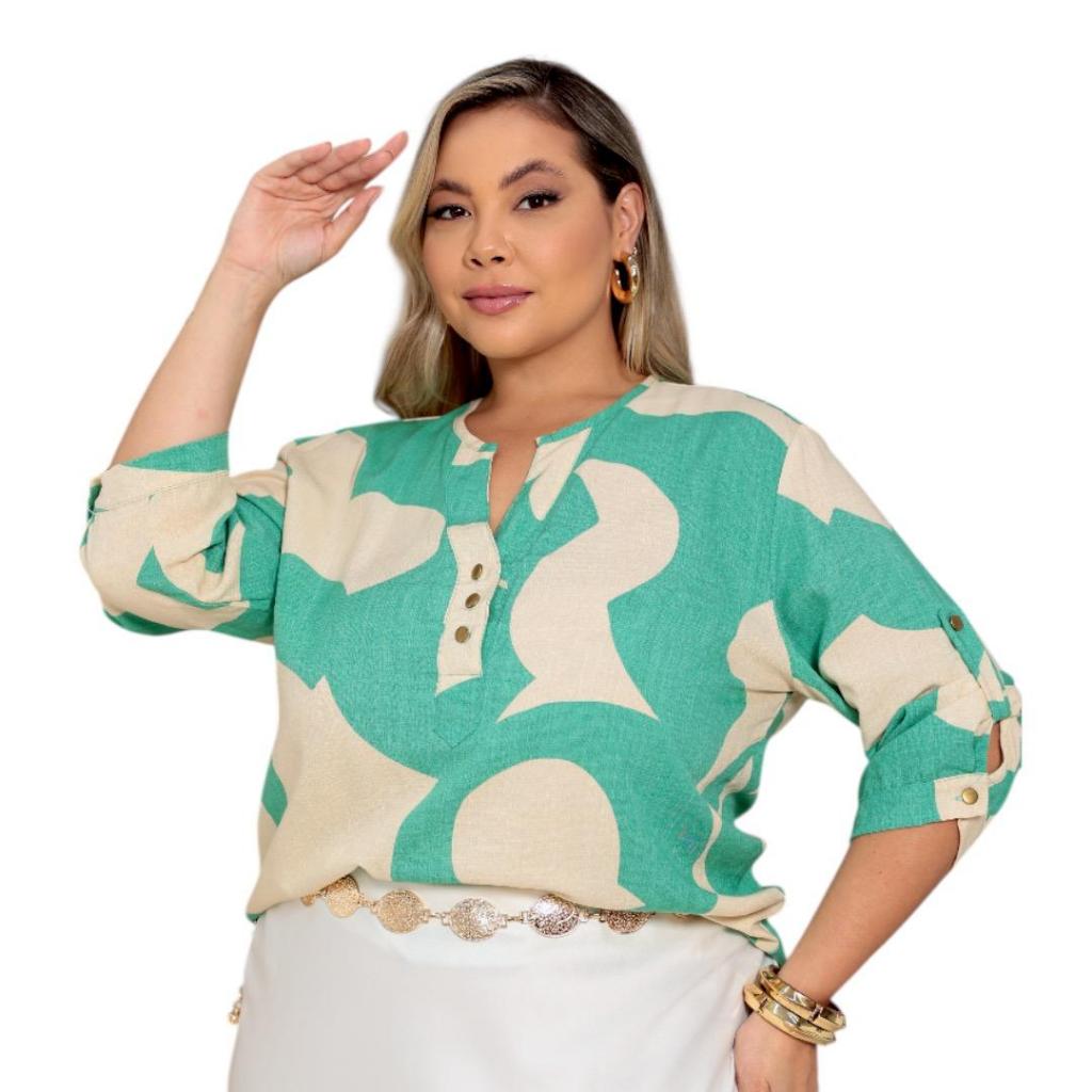 Plus Size Camisa Social Feminina Estampada Manga 3/4