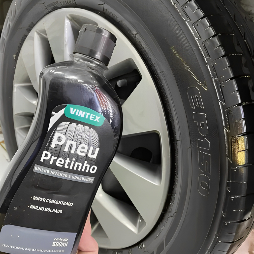 PNEU PRETINHO 1,5L VINTEX DESCRIÇÃO: O Pneu Pretinho é um produto que foi especialmente desenvolvido para proteger, conservar e dar brilho aos pneus em geral. Promove proteção prolongada, brilho intenso e duradouro que deixa os pneus com aspecto de novos - Brilho molhado - Super concentrado MODO DE USO: 1. Lave bem os pneus removendo toda a sujeira como lama, barro, etc 2. Em seguida, aplique o produto puro com o auxílio do Aplicador de Espuma