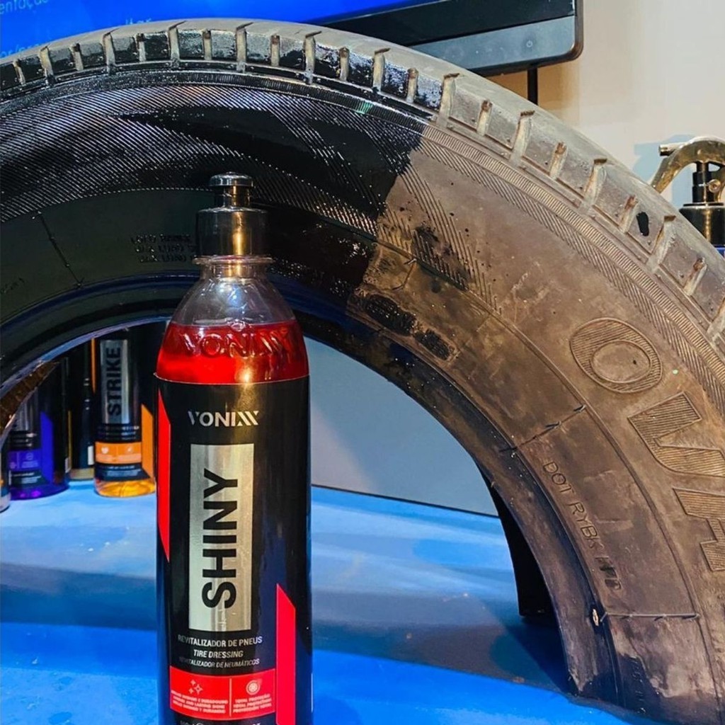 SHINY 1,5L - REVITALIZADOR DE PNEUS DESCRIÇÃO: Shiny é um produto desenvolvido exclusivamente para uso em pneus que renova, protege e dá brilho intenso e duradouro aos pneus. O produto não sai ao entrar em contato com a água, podendo alcançar durabilidade de até 60 dias, rende de 15 a 20 aplicações em carros pequenos e mantendo o aspecto no pneu de brilho molhado. - Brilho intenso e duradouro - Total proteção DURABILIDADE: Até 60 dias de durabilidade MODO DE USO: 1. Limpar bem a superfície e em seguida aplicar o produto com um aplicador de espuma até a completa revitalização. 2. Se necessário repetir a operação