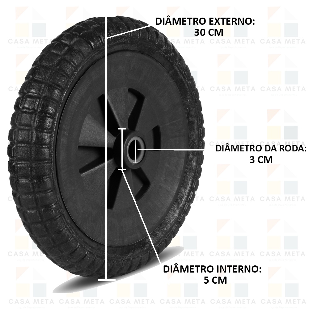 Olá, seja bem-vindo a Casa Meta Shop! Temos o objetivo de lhe ofertar uma grande variedade de produtos para Casa, Decoração e Bem-Estar. Sempre procuramos garantir qualidade e um ótimo atendimento no pré e pós venda gerando a melhor experiência para você. Assim estabelecendo uma relação de confiança! Nosso processo de embalagem garante uma entrega rápida e segura, que só a Casa Meta garante. RODA P/ CARRINHO DE MAO 325X65 S/ CAMARA 3/4CURTO - Pneu fabricado em PVC expandido. Não possui câmara de ar, não murcha e nem fura. - Roda injetada em PP de alta resistência. - Eixo curto, para uso em diversos tipos de carrinhos. - Bucha do eixo auto lubrificante, fabricada em Nylon com grafite. - Não é 100% maciço, então se molda ao terreno reduzindo o esforço e absorve impacto do uso diário. - Capacidade de carga: 150Kg DIMENSÕES - Diâmetro pneu: 325m - Largura do pneu: 65mm - Diâmetro da roda: 241mm - Comprimento de Cubo: 82mm Qualquer dúvida estamos a disposição!