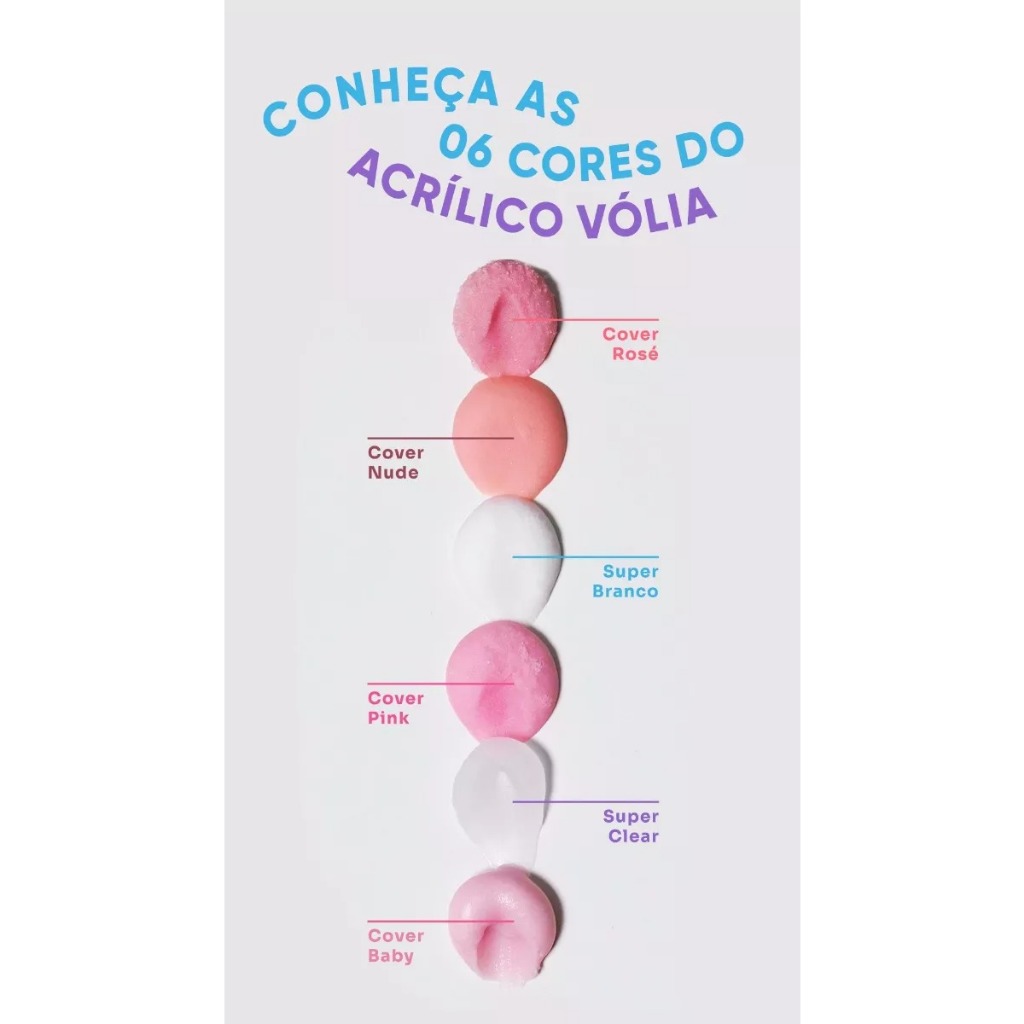 Agora você pode entrar na jornada do CRIE, USE e MISTURE e se jogar sem medo, pois o Acrílico Vòlia é: - Desenvolvido e fabricado 100% no Brasil, por nós Vòlia Cosméticos; - Aprovado por mais de 150 especialistas no sistema acrílico; - A primeira a ser totalmente em embalagens em refil, o que representa sustentabilidade, economia e praticidade no seu dia a dia. E fora tudo isso… Com as 6 tonalidades disponíveis: - Cover Baby: Rosa clarinho; - Cover Pink: Rosa mais forte; - Cover Rosé: Rosa queimado; - Cover Nude: Rosa alaranjado; - Super Clear; - Super Branco. Você pode criar INFINITAS POSSIBILIDADES de cor