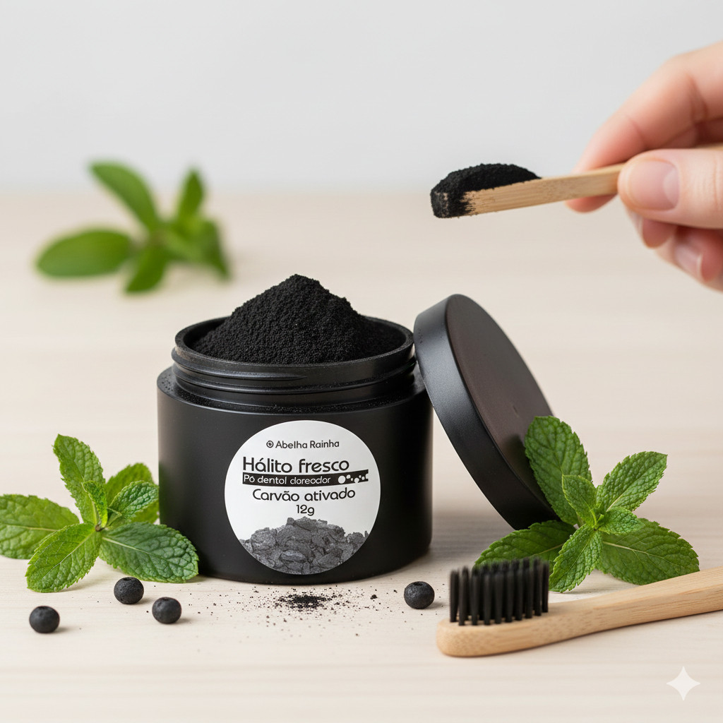 Pó Dental Clareador com Carvão Ativado Hálito Fresco Abelha Rainha Finalidade: Higieniza e limpa os dentes amarelados. Composição: calcium glycerophosphate, sodium lauryl sulfate, sodium saccharin, zink stearate, sodium bicarbonate, magnesium carbonate, activated charcoal, talc. Modo de Uso: No momento da escovação, cubra o creme dental com uma pequena quantidade do pó branqueador e escove os dentes normalmente. Utilize de duas as três vezes por semana. Restrições de Uso: Não utilize em crianças menores de cinco anos. Não use em casos de gengivite ou doenças bucais. Suspenda o uso se surgir irritação ou sensibilidade. Não ingerir. Cuidados: Manter fora do alcance de crianças e em local fresco e seco.