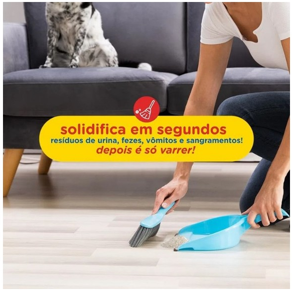 Sejam bem vindos!! O Seca Xixi Varrer da Petmais, é um revolucionário solidificador ecológico que apenas em um minuto transforma a urina do pet em pó, deixando o ambiente higienizado com aroma agradável de limpeza sem a necessidade de aplicação de outros produtos. Devido ao seu poder de capilaridade é ideal para uso em superfícies em geral, dispensando o uso de panos de limpeza, evitando assim qualquer contato da urina com as mãos. Isso, para os donos, significa que mesmo o xixi espalhado pelos cantinhos da casa ou locais mais difíceis de limpar, terão no produto uma solução prática e fácil para resolver este inconveniente. Ideal para filhotes que ainda não tem o local certo para fazer o xixi e que vivem demarcando território por toda casa. PRÁTICO E RÁPIDO Em minutos transforma o xixi de PETS e HUMANOS em pó! Pode ser usado também em dejetos pastosos, que serão endurecidos, facilitando o recolhimento. HIGIÊNICO Sem a necessidade do seu contato com a urina, sem sujar panos e produtos de limpeza. Fácil de Varrer. Muito mais higiênico, deixando o ambiente higienizado e com cheiro agradável. ECOLÓGICO Evita a lavagem de toda a área apenas por um xixi, economiza água e produtos de limpeza e pode ser descartado na natureza. VERSÁTIL Além de limpar o local, higieniza e remove o odor, deixando um agradável cheiro de limpeza, pode ser aplicado em pisos cerâmicos, madeira e vinílicos. COM USAR Aplique o produto sobre o xixi ou fezes do seu animalzinho ou de algum humano e aguarde. Após secar, estará pronto para ser varrido. Além de limpar o local, o produto higieniza e remove o odor deixando um agradável cheiro de limpeza. Pode ser aplicado em pisos de cerâmica e vinílicos. *NA PRIMEIRA APLICAÇÃO, TESTE O PRODUTO EM UMA PEQUENA ÁREA PARA EVITAR MANCHAS INDESEJADAS. INDICAÇÃO: Indicado para higienização de ambientes onde urinam ou defecam. PRECAUÇÕES: Produto de uso externo. Mantenha fora do alcance de crianças e animais domésticos. Evite aspirar o produto.