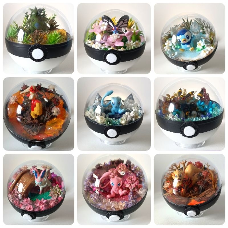 Pokébolas com pokémon, terrários pokémon, Pokebolas artesanais, dioramas pokémon, paraísos pokémon.