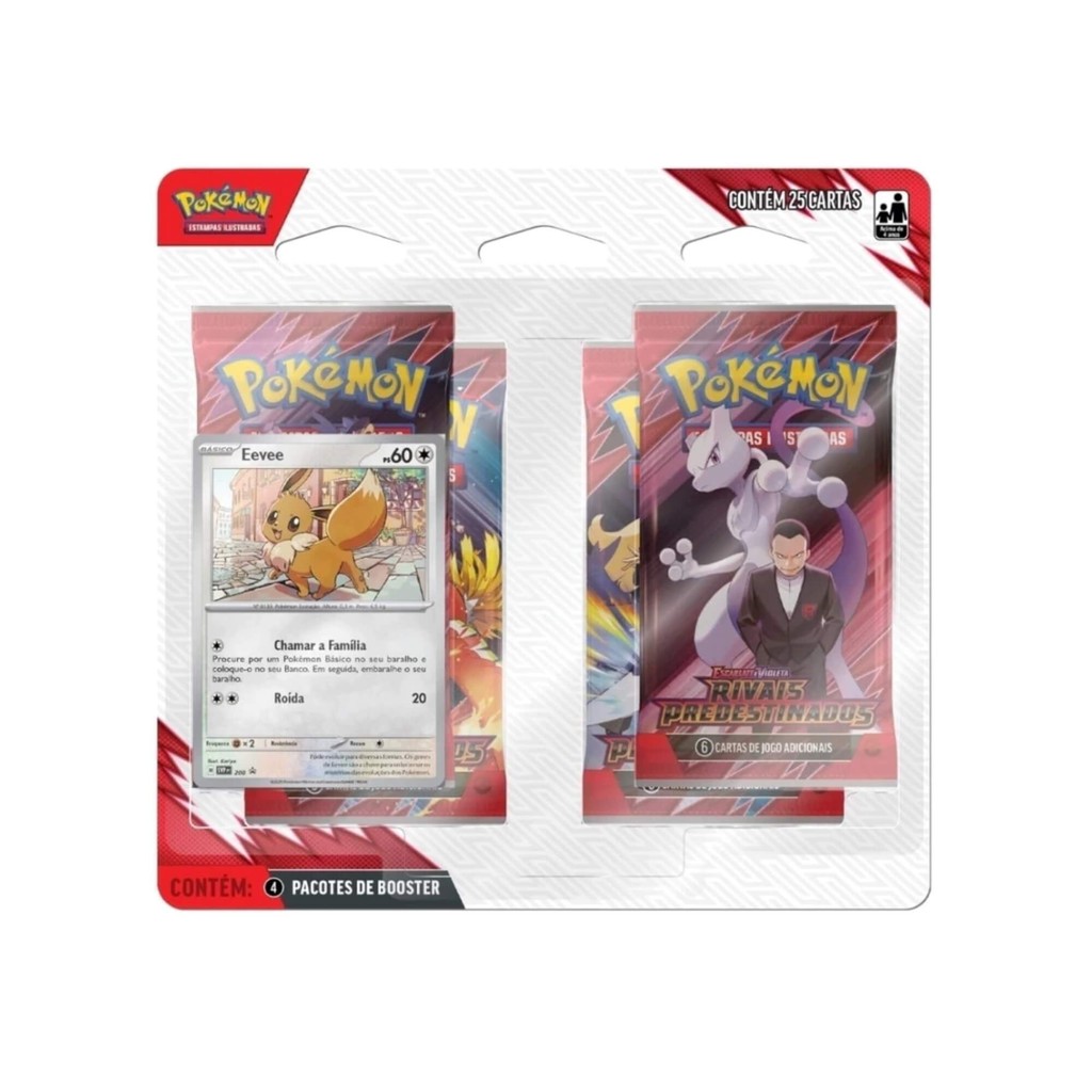 OBS: ANÚNCIO RELATIVO A DUAS UNIDADES JUNTAS, SENDO AMBAS LACRADAS E ORIGINAIS DA COPAG. Prepare-se para a mais intensa batalha do universo Pokémon Estampas Ilustradas. A nova expansão Escarlate e Violeta – Rivais Predestinados coloca Treinadores lendários frente a frente com os vilões mais emblemáticos da franquia, em um conflito que vai além das cartas. Com foco em rivalidades clássicas, parcerias poderosas e o retorno da Equipe Rocket, esta coleção promete ser uma das mais impactantes da série Escarlate e Violeta. - Formato das cartas: 63mm x 88mm. Características: - Marca:Copag - Modelo:35561 *Imagens Meramente Ilustrativas* Conteúdo da Embalagem: Blister Quádruplo Escarlate e Violeta 10 - Rivais Predestinados - Zarude O Blister Quádruplo traz para você: - 4 pacotes de booster de Pokémon Estampas Ilustradas; - 1 carta holográfica promocional - 1 carta codificada para o Pokémon Estampas Ilustradas Online; Blister Quádruplo Escarlate e Violeta 10 - Rivais Predestinados - Eevee O Blister Quádruplo traz para você: - 4 pacotes de booster de Pokémon Estampas Ilustradas; - 1 carta holográfica promocional - 1 carta codificada para o Pokémon Estampas Ilustradas Online;