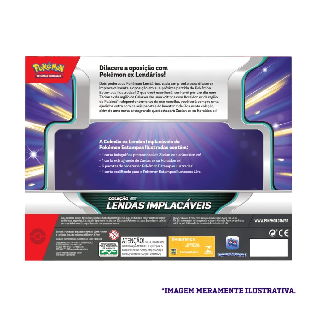 OBS. Produto novo e Lacrado de fábrica, cartas em Português, originais da Copag. Dois poderosos Pokémon Lendários, cada um pronto para dilacerar implacavelmente a oposição em sua próxima partida do Pokémon Estampas Ilustradas! O que você escolherá: ser herói por um dia com Zacian ex da região de Galar ou dar uma voltinha com Koraidon ex da região de Paldea? Independentemente da sua escolha, você terá sempre uma ajudinha extra com os seis pacotes de booster incluídos nesta coleção, além de uma carta extragrande que destacará Zacian ex ou Koraidon ex! Características: - Marca:COPAG - Modelo:35239 *Imagens Meramente Ilustrativas* Conteúdo da Embalagem: - Box Coleção - Lendas Implacáveis - Zacian Ex: 1 Carta holografica promocional de Zacian ex 1 Carta extragrande de Zacian ex 6 Pacotes de booster do Pokémon Estampas ilustradas! (Os boosters podem ser de diversas coleções) 1 Carta codificada para o Pokémon Estampas ilustradas Live Box Coleção - Lendas Implacáveis - Koraidon Ex: 1 Carta holografica promocional de Koraidon Ex 1 Carta extragrande de Koraidon Ex 6 Pacotes de booster do Pokémon Estampas ilustradas! (Os boosters podem ser de diversas coleções) 1 Carta codificada para o Pokémon Estampas ilustradas Live