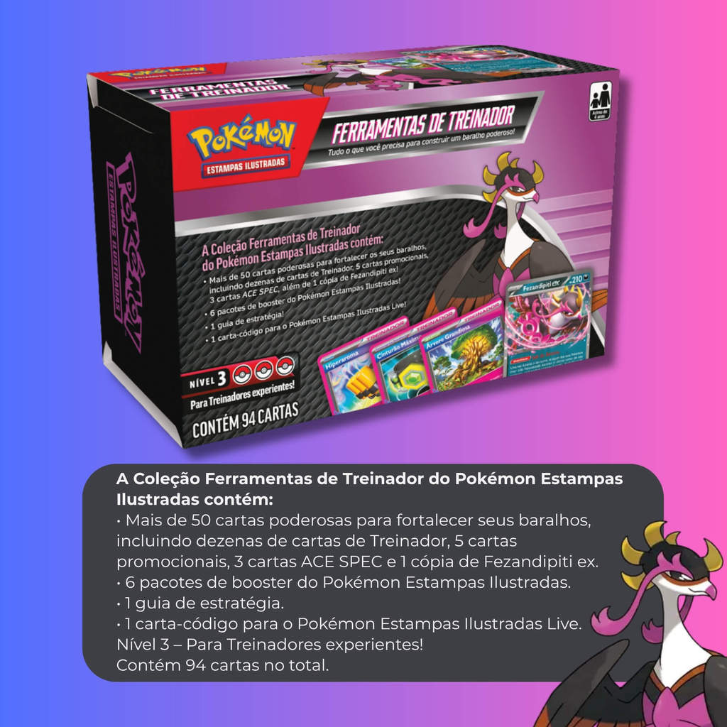 OBS. Produto novo e Lacrado de fábrica, cartas em Português, originais da Copag. A caixa ideal para construir ou reforçar o seu baralho no Pokémon Estampas Ilustradas! Características: - Marca:Copag - Modelo:35868 *Imagens Meramente Ilustrativas* Conteúdo da Embalagem: - Mais de 50 cartas poderosas para fortalecer seus baralhos, incluindo dezenas de cartas de Treinador, 5 cartas promocionais, 3 cartas ACE SPEC e 1 cópia de Fezandipiti ex. - 6 pacotes de booster do Pokémon Estampas Ilustradas. - 1 guia de estratégia. - 1 carta-código para o Pokémon Estampas Ilustradas Live. Nível 3 – Para Treinadores experientes! Contém 94 cartas no total.