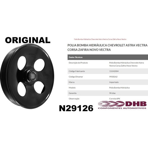 1 - Polia Bomba Direção Hidráulica ( MARCA DHB ) Código: 90409232 POLIA DE 6 ESTRIAS 6PK CORREIAS DE 6 SULCOS Modelos compatíveis: Astra 1999, 2000, 2001, 2002, 2003, 2004, 2005, 2006, 2007, 2008, 2009, 2010 ATÉ 2011 Celta 2001, 2002, 2003, 2004, 2005, 2006 ATÉ 2007 Corsa 1996, 1997, 1998, 1999, 2000, 2001, 2002, 2003, 2004, 2005, 2006, 2007, 2008, 2009 ATÉ 2010 Omega 1993, 1994, 1995, 1996, 1997 ATÉ 1998 Vectra 1994, 1995, 1996, 1997, 1998, 1999, 2000, 2001, 2002, 2003, 2004, 2005, 2006, 2007, 2008, 2009, 2010 ATÉ 2011 Zafira 1999, 2000, 2001, 2002, 2003, 2004, 2005, 2006, 2007, 2008, 2009, 2010, 2011 ATÉ 2012 -Medidas: Diâmetro Externo - 143 mm Diâmetro central (Eixo) - 19 mm Altura - 29 mm 6 Canais (PK) 6 DENTES OU 6PK VEJA ANTES DA COMPRA. *INFORMAÇÕES IMPORTANTES* 1 - NOSSOS PRODUTOS NÃO SÃO RECOMENDADOS PARA ADAPTAÇÕES, MAS SIM PARA REPOSIÇÃO. 2 - ANALISE COM CAUTELA A APLICAÇÃO DA PEÇA E, SE NECESSÁRIO, VERIFIQUE COM SEU MECÂNICO DE CONFIANÇA UTILIZANDO AS FOTOS DO ANÚNCIO PARA TER CERTEZA DE QUE ESTA É A PEÇA QUE VOCÊ REALMENTE PRECISA. 3 - SE ASSEGURE DE ESTAR EFETUANDO A COMPRA CORRETA PARA EVITAR EVENTUAIS PROBLEMAS E GASTOS. 4 - PRODUTOS QUE NECESSITAM INSTALAÇÃO A MESMA DEVE SER FEITA POR UM PROFISSIONAL CAPACITADO. 5 - NÃO NOS RESPONSABILIZAMOS POR USO INDEVIDO OU INSTALAÇÃO INCORRETA. 6 - NÃO ACEITAMOS DEVOLUÇÃO DO PRODUTO SEM A EMBALAGEM ORIGINAL. 7 - TODOS PRODUTOS SÃO NOVOS COM 3 MESES DE GARANTIA E NOTA FISCAL. 8 - À POSTAGEM É FEITA NO MESMO DIA PARA PEDIDOS FEITO ATÉ AS 13HS. 9 - TIRE TODAS AS DUVIDAS ANTES DE CLICAR EM COMPRAR. • AGRADECEMOS A SUA PREFERÊNCIA! N-29126