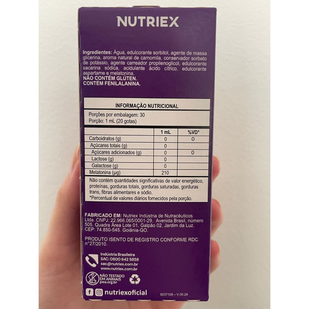 Melatonina é um hormônio produzido pela glândula pineal do cérebro, que possui como principal função regular o ciclo circadiano, estimulando o sono ao final do dia. Fonte de Melatonina Sabor Camomila Facilidade na Administração Zero Açúcar Zero Lactose Não Contém Glúten Informações de uso presentes na embalagem do produto: Sugestão de uso: Adultos ≥ 19 anos: A dose recomendada de PoliMais Melatonina Fast é de 20 gotas ao dia, uma hora antes de dormir. ESTE PRODUTO NÃO É UM MEDICAMENTO. NAO EXCEDER A RECOMENDAÇÃO DIÁRIA DE CONSUMO INDICADA NA EMBALAGEM. MANTENHA FORA DO ALCANCE DE CRIANÇAS. ESTE PRODUTO NAO DEVE SER CONSUMIDO POR GESTANTES, LACTANTES, CRIANÇAS, PESSOAS ENVOLVIDAS EM ATIVIDADES QUE REQUEREM ATENÇÃO CONSTANTE. PESSÕAS COM ENFERMIDADES E/OU SOB USO DE MEDICAMENTOS, CONSULTE SEU MÉDICO. Cuidados de conservação: Armazenar em sua embalagem original, em local fresco, ao abrigo da luz e umidade. Após aberto manter a embalagem fechada em local fresco, ao abrigo da luz e umidade.
