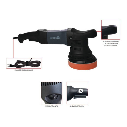 A Politriz Roto Orbital Pro 15mm SGT5117 da SIGMA é uma ferramenta de alta performance desenvolvida para profissionais que exigem precisão e eficiência no acabamento de superfícies. Com motor de 900W e uma rotação de até 3900 RPM, ela proporciona uma ação potente e constante, ideal para polimento de carros, móveis e outras superfícies de forma rápida e uniforme. Seu sistema roto orbital de 15mm de diâmetro oferece controle superior, evitando marcas e garantindo um acabamento impecável, seja para tarefas de polimento, lustração ou remoção de riscos. O design ergonômico da Politriz Roto Orbital Pro, com alças estrategicamente posicionadas, proporciona conforto durante o uso prolongado, minimizando o cansaço do operador. Seu sistema de proteção contra sobrecarga e controle eletrônico de velocidade permitem ajustes finos conforme a necessidade do trabalho, aumentando a durabilidade e a segurança da ferramenta. A politriz é uma escolha robusta e confiável para profissionais que buscam qualidade e eficiência nos serviços de acabamento. CARACTERÍSTICAS – Design ergonômico com empunhadura tipo roto orbital; – Leve e equilibrada; – Baixíssima vibração e ruído; – Menor aquecimento; – Cabo com 5m de comprimento siliconado; – 6 níveis de velocidade; – Três empunhaduras: Frontal e tipo D. Acessórios 1 - Disco velcrado 5” rosca M8; 1 - Chave allen; 1 - Par de escovas de carvão extra; 1 - Boina 5”; 1 - Manual; 1 - Manípulo lateral