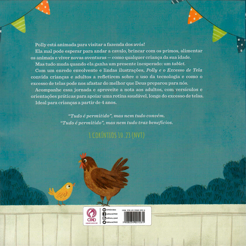Livro Polly e o Excesso de Tela | Betsy Childs Howard Ilustrado por Samara HardyBetsy Childs HowardAjude suas crianças a descobrirem o equilíbrio digital através de uma encantadora história com fundamento bíblico. Em "Polly e o Excesso de Tela", Betsy Childs Howard apresenta uma narrativa cativante sobre Polly, uma menina que, ao ganhar um tablet nas férias na fazenda dos avós, vê os momentos de aventura e convívio familiar serem substituídos pelo mundo virtual. Com ilustrações encantadoras e linguagem acessível para crianças de 3 a 7 anos, este livro oferece uma oportunidade única para pais e educadores abordarem o uso consciente da tecnologia. A história conduz pequenos leitores a refletirem sobre a importância do equilíbrio entre o digital e as experiências da vida real, tudo à luz dos princípios das Escrituras. Principais Benefícios e Destaques: Ensino sobre Equilíbrio Digital: Aborda de forma sensível os riscos do excesso de tempo em telasFundamento Bíblico: Oferece perspectiva cristã sobre o uso saudável da tecnologiaRecurso para Adultos: Inclui seção especial com versículos e orientações práticas para pais e educadoresFaixa Etária Ideal: Conteúdo perfeitamente adaptado para crianças de 3 a 7 anosHistória Encantadora: Narrativa envolvente que prende a atenção dos pequenos leitoresPerfeito para leitura em família e escolas cristãs. Adquira já este recurso essencial e ajude suas crianças a cultivarem hábitos digitais saudáveis desde cedo!