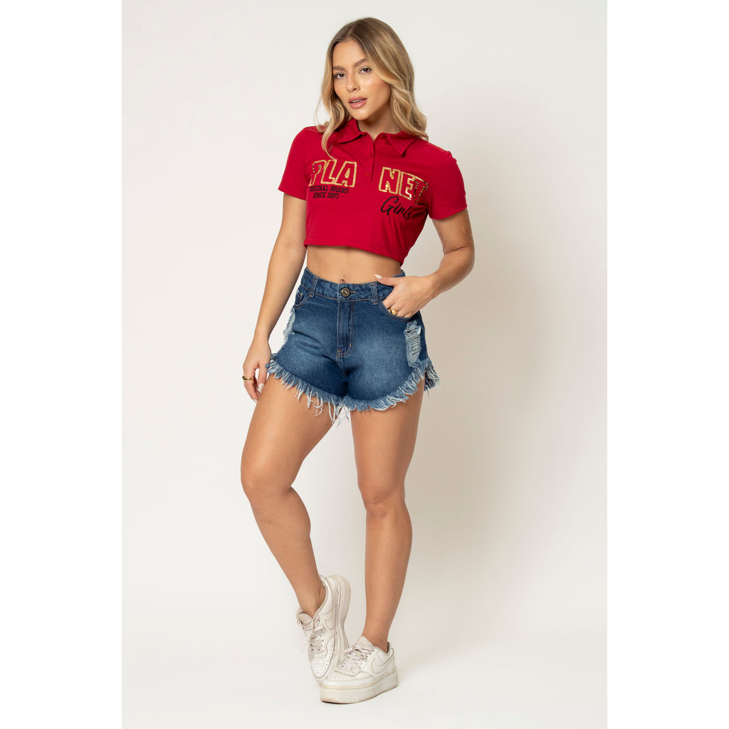 Polo Cropped Feminina em Paetê Planet Girls Vermelho Médio