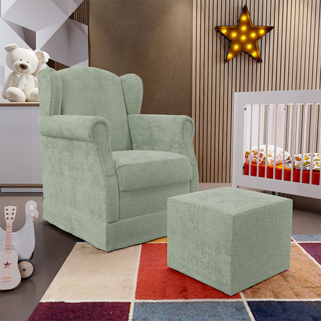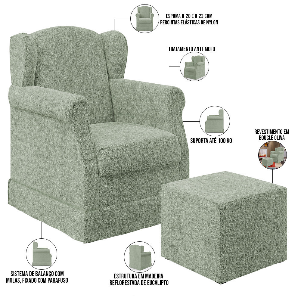 Poltrona De Amamentação Com Balanço E Puff Elisa P02 Bouclê Oliva - Lyam Decor