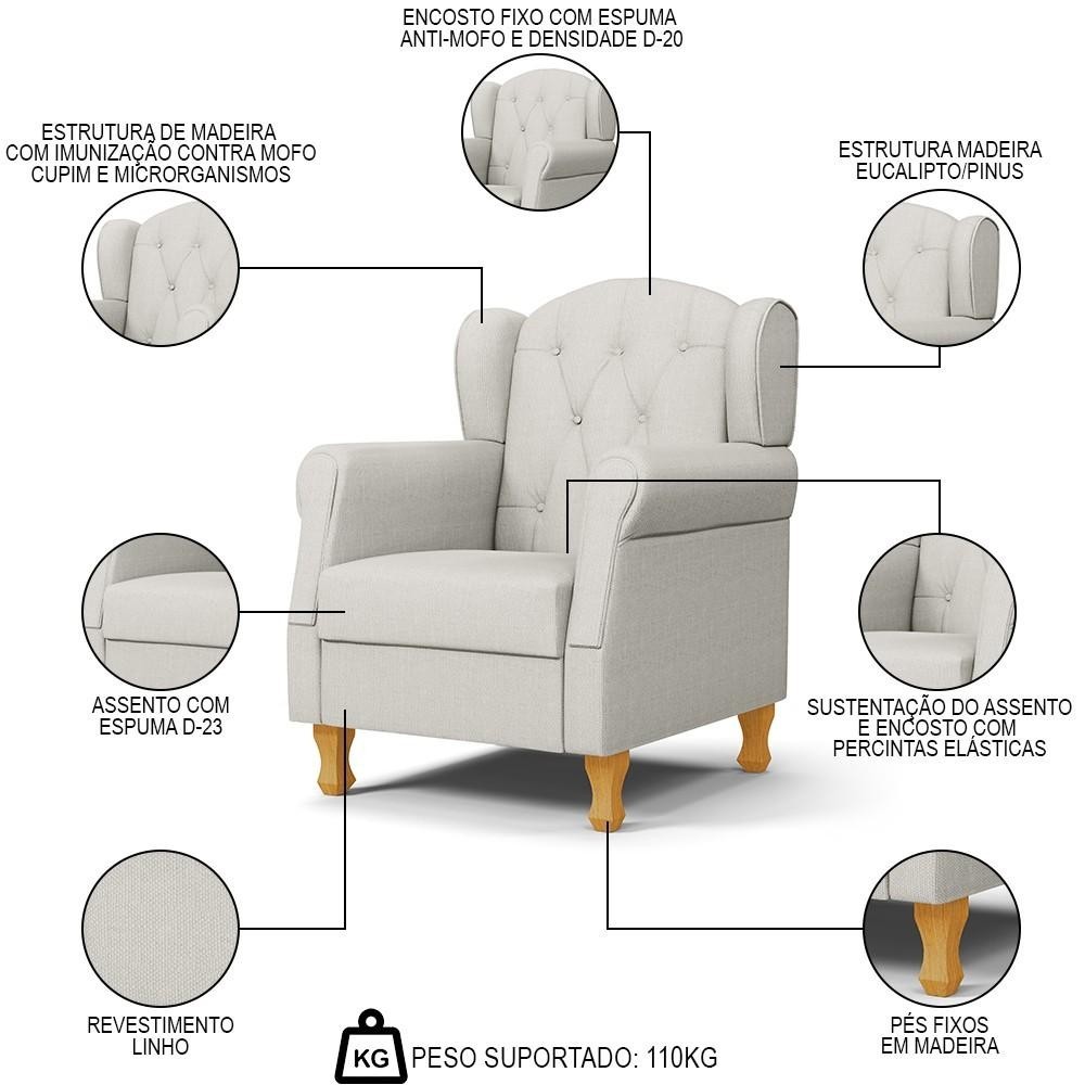 Poltrona de Amamentação e Descanso com Pés de Madeira Lucy P04 Linho Off White - Mpozenato