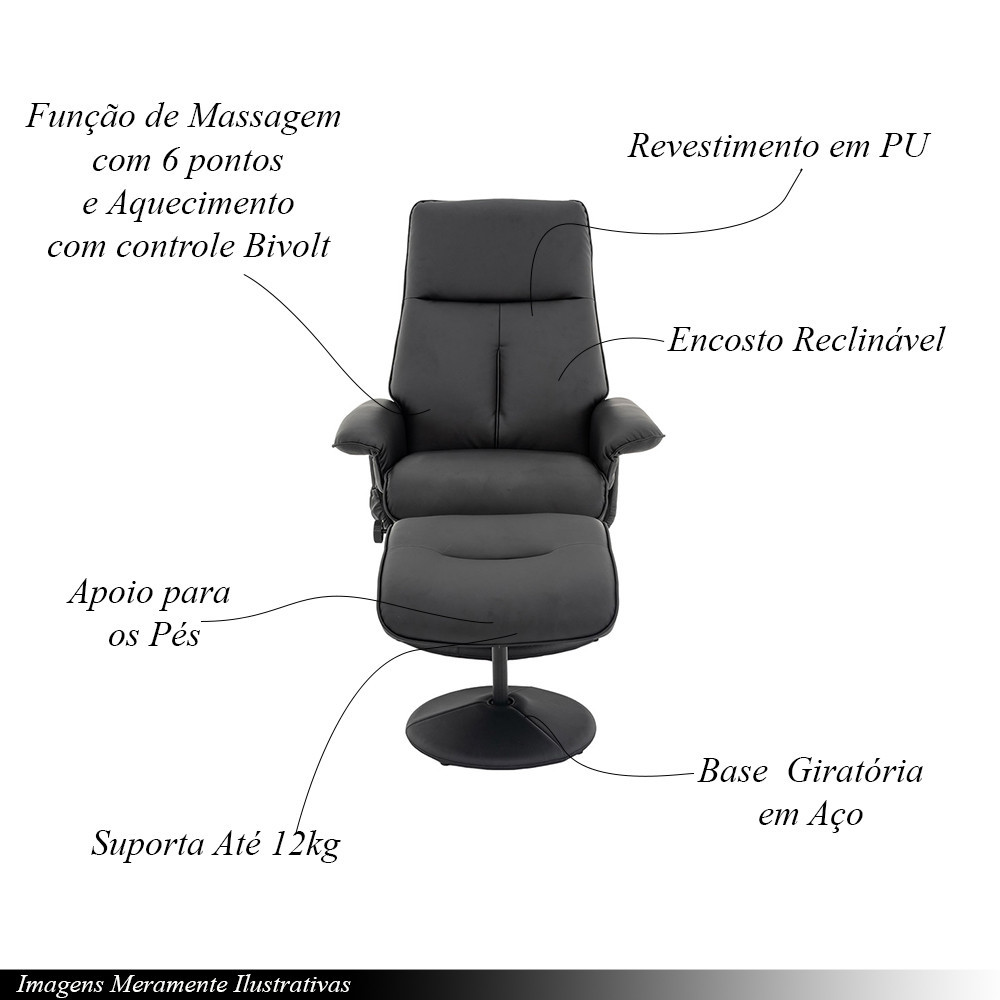 Poltrona de Massagem Reclinável e Giratória Arizona com Apoio de Pés Pu Preto G56 - Gran Belo