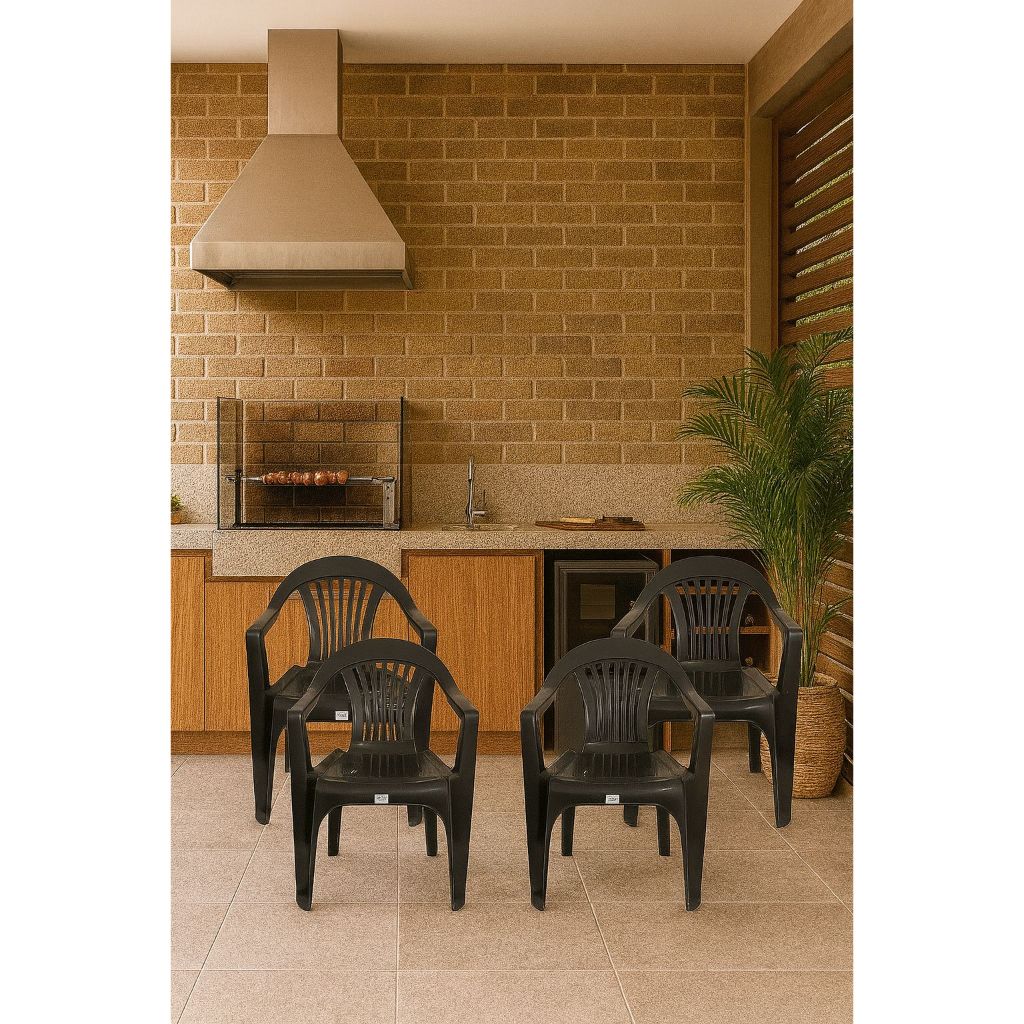 Transforme sua área gourmet, varanda ou espaço de churrasco com este kit de 4 cadeiras plásticas pretas resistentes e confortáveis. ✔️ Fabricadas em plástico reforçado com certificação Inmetro, suportam o uso diário com segurança. ✔️ Design anatômico com encosto ergonômico para maior conforto em reuniões familiares ou entre amigos. ✔️ Fáceis de limpar, empilháveis e práticas para guardar sem ocupar espaço. ✔️ Ideais para áreas externas, festas, bares, restaurantes, varandas e espaços gourmet Igreja. Suportante Até 180kg Dimensões: Comprimento: 572cm largura: 58cm Altura: 915cm Largura de Assento: 43cm Largura do encosto: 57cm Espessura da cadeira: 5cm Altura do Assento ao Chão: 45cm Profundidade do assento: 39cm Comprimento do encosto: 53cm Comprimento Apoio de braço: 32cm