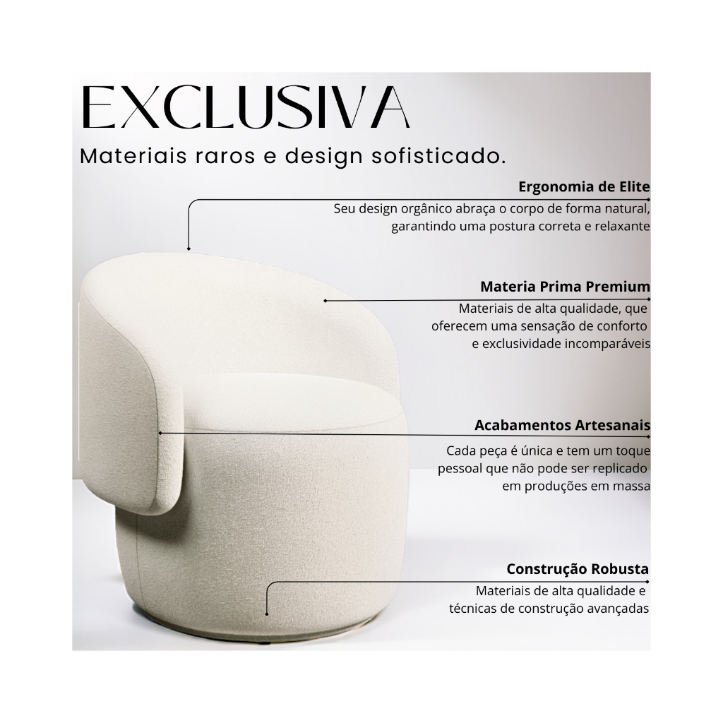 A poltrona Aisha é a combinação perfeita de design sofisticado, conforto absoluto e inovação. *A poltrona não é giratória.* Projetada para quem busca elegância e bem-estar, essa peça une acabamento impecável e materiais de alto padrão para transformar qualquer ambiente. Seu formato orgânico proporciona uma ergonomia de elite, garantindo um encaixe natural do corpo, ideal para quem valoriza conforto em longos períodos de uso. Revestida com o luxuoso RoyalBouclé, a Aisha vai além da estética sofisticada. Seu tecido conta com propriedades termorreguladoras adaptativas, que equilibram a temperatura ao toque, proporcionando uma experiência sempre aconchegante, independente da estação do ano. -Ergonomia de elite – Assento e encosto projetados para suporte ideal da coluna e alívio de tensões -Acolhimento superior – Espuma de alta densidade que se molda ao corpo, oferecendo maciez e durabilidade -Base resistente e estável – Estrutura reforçada para suporte seguro e equilíbrio perfeito -Design envolvente – Formato que abraça o corpo, garantindo sensação de aconchego incomparável Transforme Qualquer Ambiente com Sofisticação -A poltrona Aisha é a peça-chave para elevar a estética e o conforto de qualquer espaço. Seu design moderno e imponente torna-a perfeita para salas de estar, recepções e clínicas, proporcionando um ambiente mais sofisticado, acolhedor e exclusivo. Seja para criar uma atmosfera elegante em casa, oferecer um toque de requinte à recepção do seu negócio ou garantir conforto aos pacientes em um consultório, a Aisha muda completamente o cenário, tornando qualquer espaço mais convidativo e luxuoso. "A poltrona Aisha superou minhas expectativas! O tecido bouclé é maravilhoso, macio ao toque e se adapta à temperatura do ambiente. Perfeita para minha sala de estar!" — Juliana R. "Coloquei a Aisha na recepção da minha clínica e os pacientes sempre elogiam. O design é sofisticado e a ergonomia proporciona um conforto incrível!" — Dr. Ricardo M. Garantia do produto: “Satisfação garantida ou devolvemos 100% do seu dinheiro. Quando você adquire qualquer produto comercializado pela MR DELUXE, você está automaticamente coberto pela nossa garantia, isso significa que você tem os 7 primeiros dias após o recebimento do produto para testar, aprovar e se satisfazer. Caso contrário, devolvemos todo o valor pago sem burocracia alguma. Isso inclui trocas e devoluções gratuitas dentro desse período. -Comprar uma unidade por vez- Medidas: Altura: 77 cm Largura: 73 cm Profundidade: 62 cm Altura até o Assento: 43 cm Encosto 35cm. Suporta até 125 kg A poltrona não é giratória. -Estoque Limitado – Últimas Unidades Disponíveis! Devido à alta demanda, a poltrona Aisha está com estoque reduzido e pode se esgotar a qualquer momento. Garanta a sua agora e transforme seu ambiente com elegância e conforto! -Transforme seu espaço com a Poltrona Aisha e descubra o equilíbrio perfeito entre luxo, tecnologia e bem-estar!