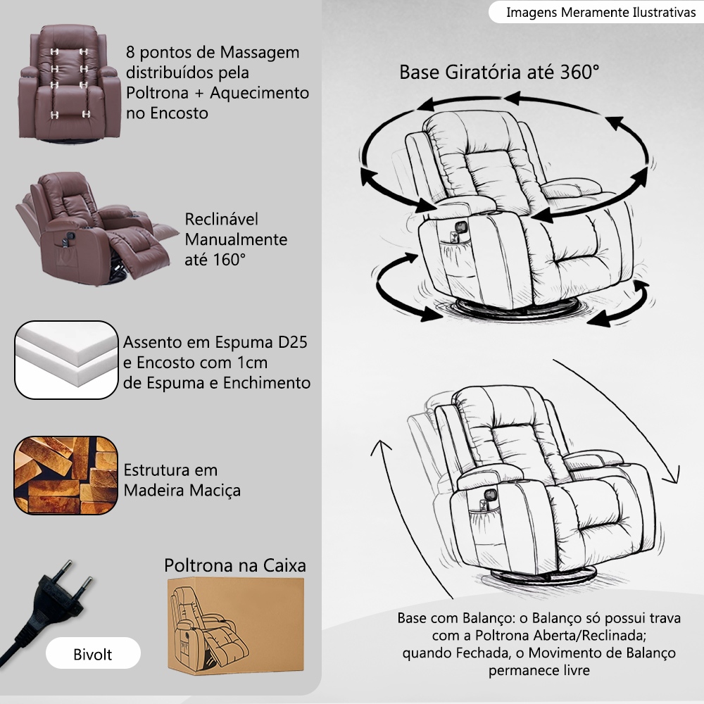 A Poltrona do Papai Austin combina Design Moderno, Conforto e Tecnologia, proporcionando Relaxamento Total. Estrutura Robusta e Revestimento Premium Feita com Madeira Resistente, oferece Durabilidade e Segurança. O Revestimento em PU Premium garante Sofisticação, Fácil Limpeza e Alta Resistência. Conta com 2 Porta-Copos Embutidos e Revisteiro Lateral para mais praticidade. Reclinável, Retrátil e Giratória Com Reclinação de Até 160° ajustada por Manopla Manual, permite encontrar a posição ideal. O Assento Retrátil amplia o conforto para as pernas. A Base Giratória com Balanço proporciona Liberdade de Movimento e Relaxamento Contínuo. Importante: a Poltrona não possui Trava. Massagem e Aquecimento para o Máximo Bem-Estar Com Controle Multifuncional Bivolt, oferece 8 Pontos de Massagem estrategicamente distribuídos para aliviar tensões. O Sistema de Aquecimento no Encosto traz mais aconchego nos dias frios. Principais Benefícios: Estrutura Resistente e Revestimento Premium Encosto e Assento Reclináveis Até 160° Retrátil, Base Giratória com Balanço 8 Pontos de Massagem e Aquecimento no Encosto Porta-Copos e Revisteiro para Mais Praticidade Desfrute do máximo em conforto com a Poltrona Austin! Dimensões do Produto: Frente Fechada: Largura: 86cm Altura: 92cm Largura livre do Encosto: 55cm Largura do Braço: 15cm Altura do Assento ao Chão: 51cm Fechada: Profundidade:92cm Altura livre do Encosto: 66cm Profundidade livre do Assento: 53cm Altura do Braço: 21cm Abertura Total: Altura: 86cm Profundidade livre do Assento: 99cm Profundidade: 153cm Características do Produto: Material da Estrutura: Madeira Maciça Encosto: 1cm de Espuma e Enchimento Assento: Espuma D25 Sistema Reclinável: Com Alavanca Manual embutida no braço (Como mostra nas Imagens) Outros Sistemas: 8 pontos de Massagem Distribuídos Pela Poltrona e Aquecimento nos Encostos (com Controle Multifuncional) Intensidade: Conta com 4 modos diferentes de vibração de massagem. Detalhes: 2 Porta Copos Embutido nos Braços e Revisteiro Lateral Pés: Em Ferro Reclinação: Sim, até 160° Rotação: Gira em 360º Balanço: Sim, não possui travas Voltagem: Bivolt Revestimento: PU Importante: o balanço só é travado com a poltrona aberta/reclinada; quando fechada, o movimento de balanço permanece livre. O giro é contínuo, sem trava. Conteúdo da Embalagem: 1 Poltrona Necessita de Montagem: Sim. Instruções/Cuidado: Utilizar um pano levemente umedecido com água, seguido de pano seco. Evitar exposição ao sol, para que o produto não sofra alterações na cor. Não limpar com escovas ou produtos abrasivos. Observações Importantes: - As imagens são meramente ilustrativas e não acompanham objetos de decoração e eletros - Pode haver alguma diferença de tonalidade entre a imagem e o produto, por conta do tratamento de imagens e a calibração de cores da sua tela. - Por ser um produto de fabricação artesanal, podem ocorrer pequenas variações nas dimensões finais, sem alterar o design, o formato ou a qualidade do modelo. - Todos os nossos produtos são enviados devidamente embalados e com total segurança - Confira as dimensões do produto no momento da compra e certifique-se de que passará normalmente por elevadores, portas, escadas e/ou corredores, evitando assim futuros desagrados ou imprevistos com a entrega do produto.