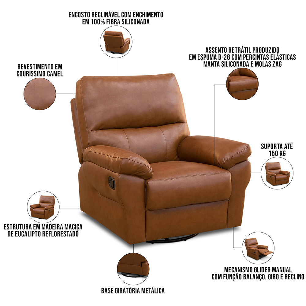 Poltrona do Papai Reclinável e Giratória Oliver D06 Couríssimo Camel - Lyam Decor